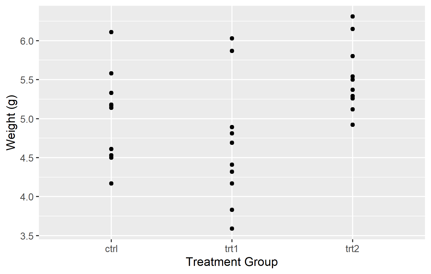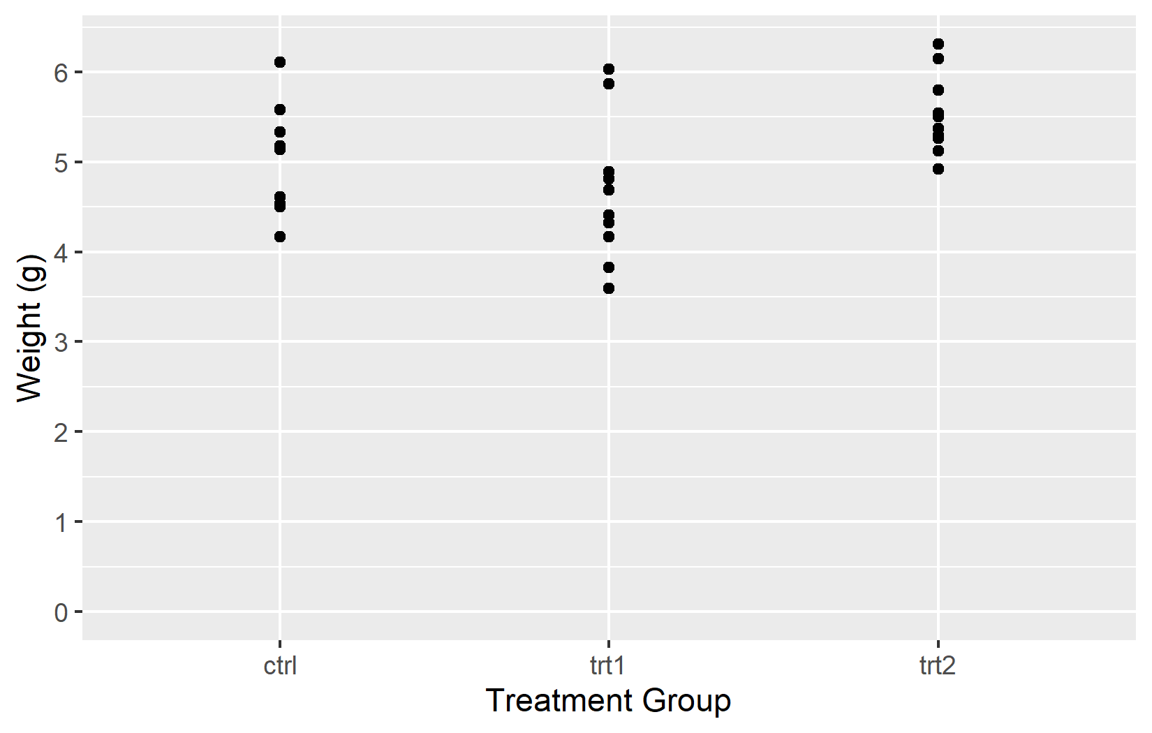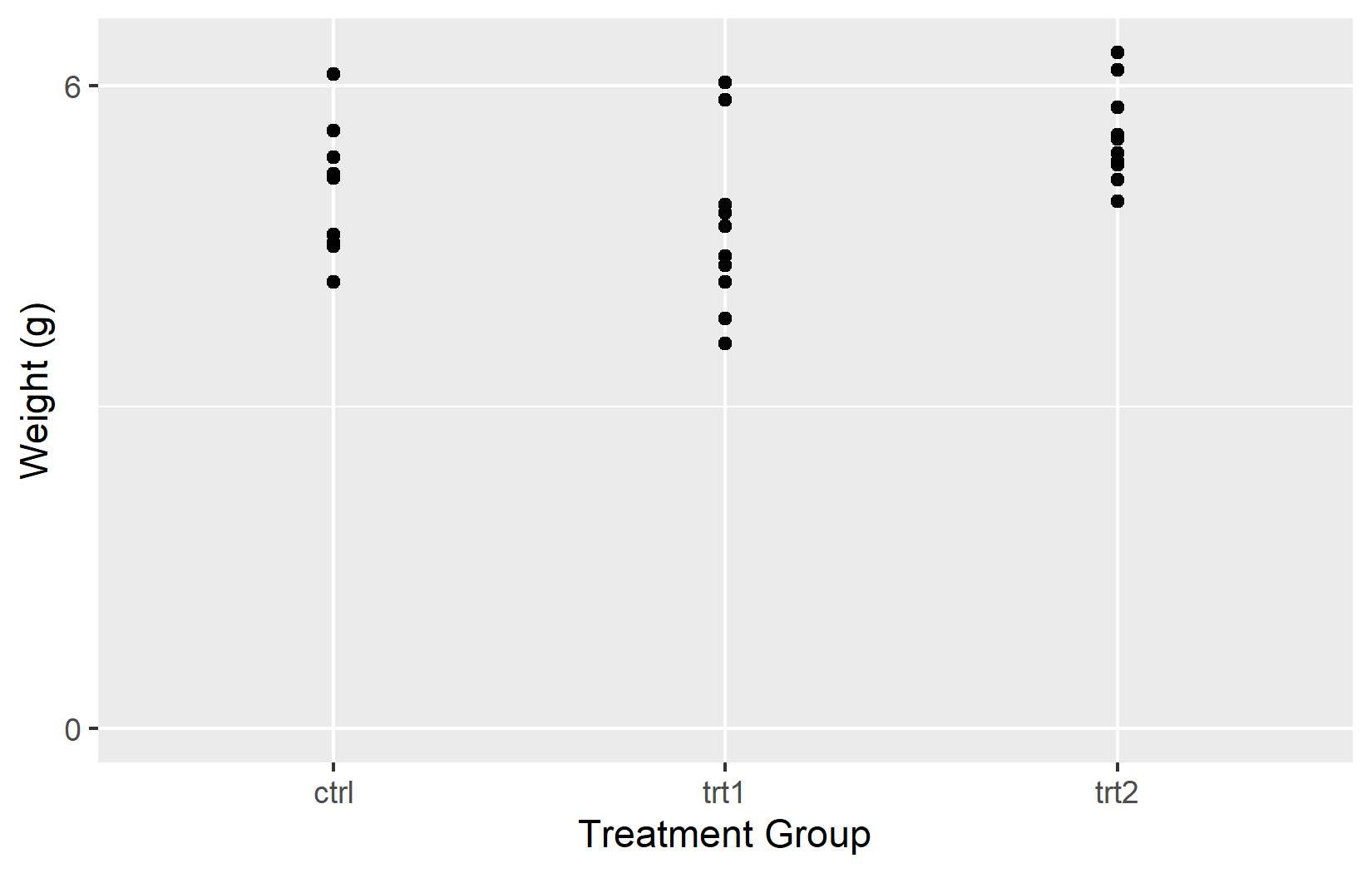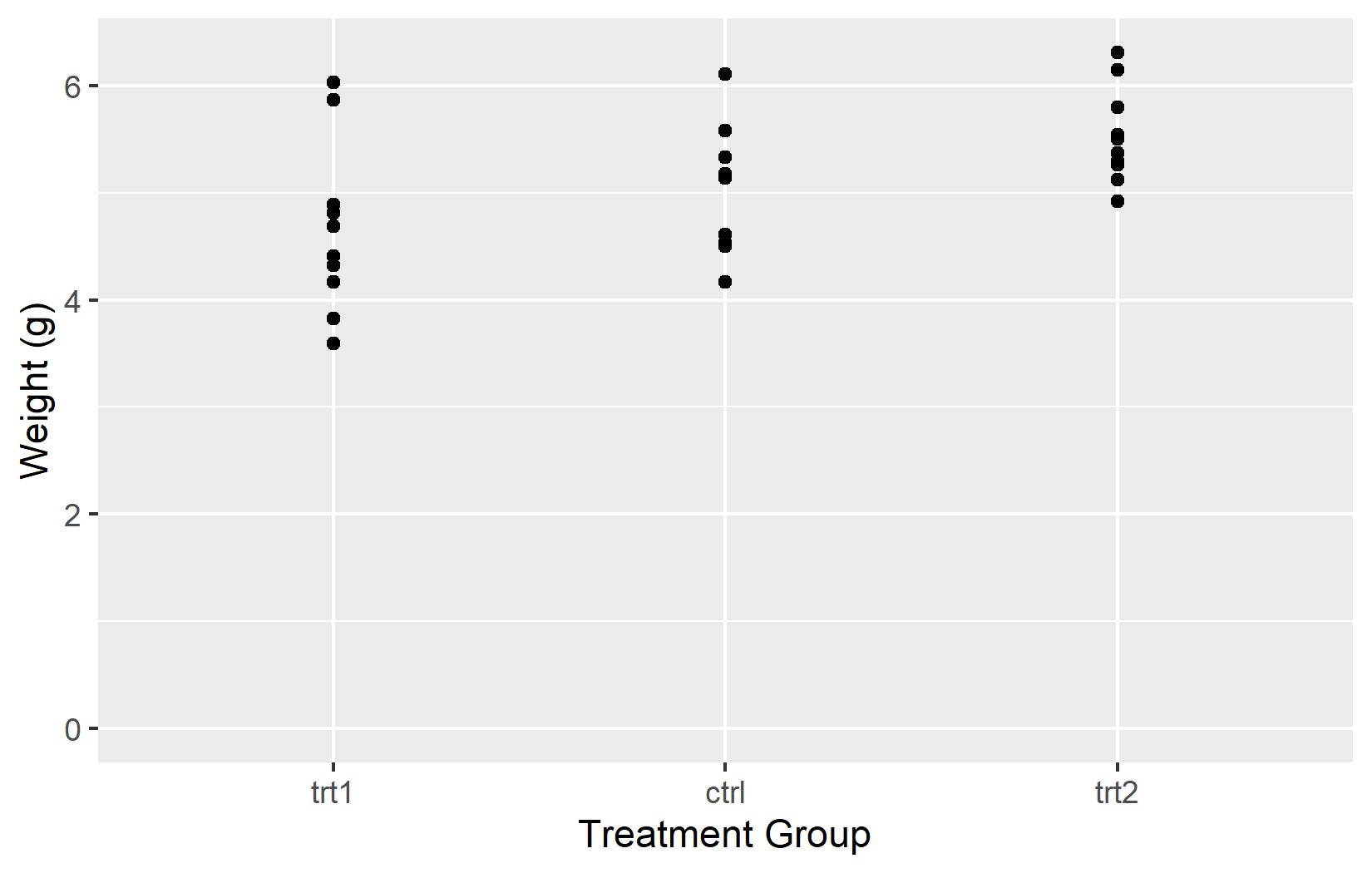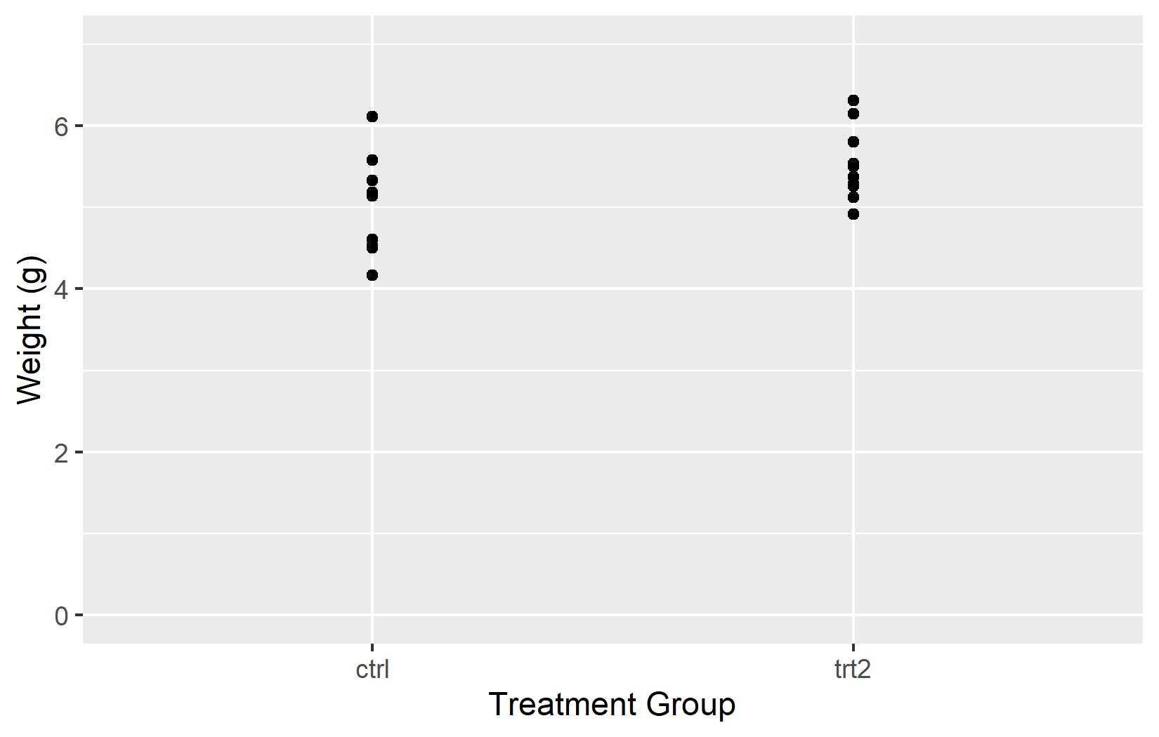 The most basic customization is the axis title. By default, ggplot2 uses the column name from the data - weight and group in our case. These are fine for exploratory work, but for any shared output one should provide informative titles that include units where applicable. The name argument does exactly this: