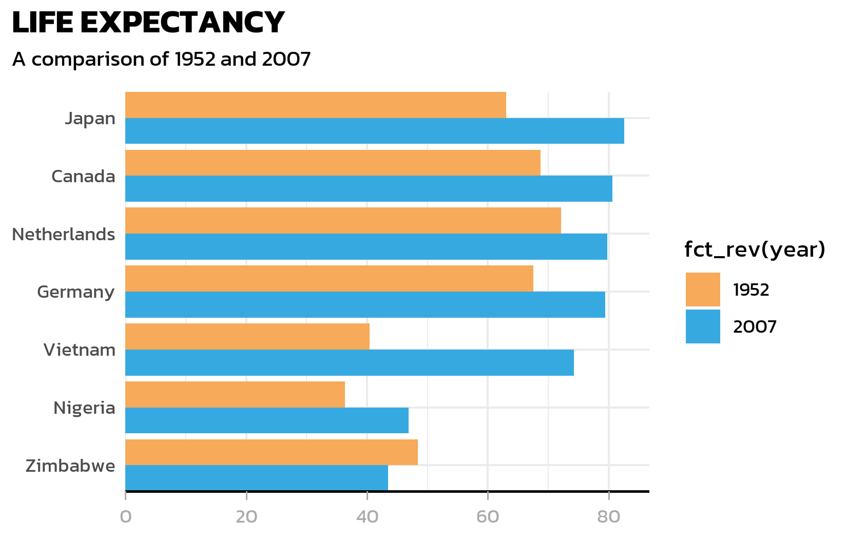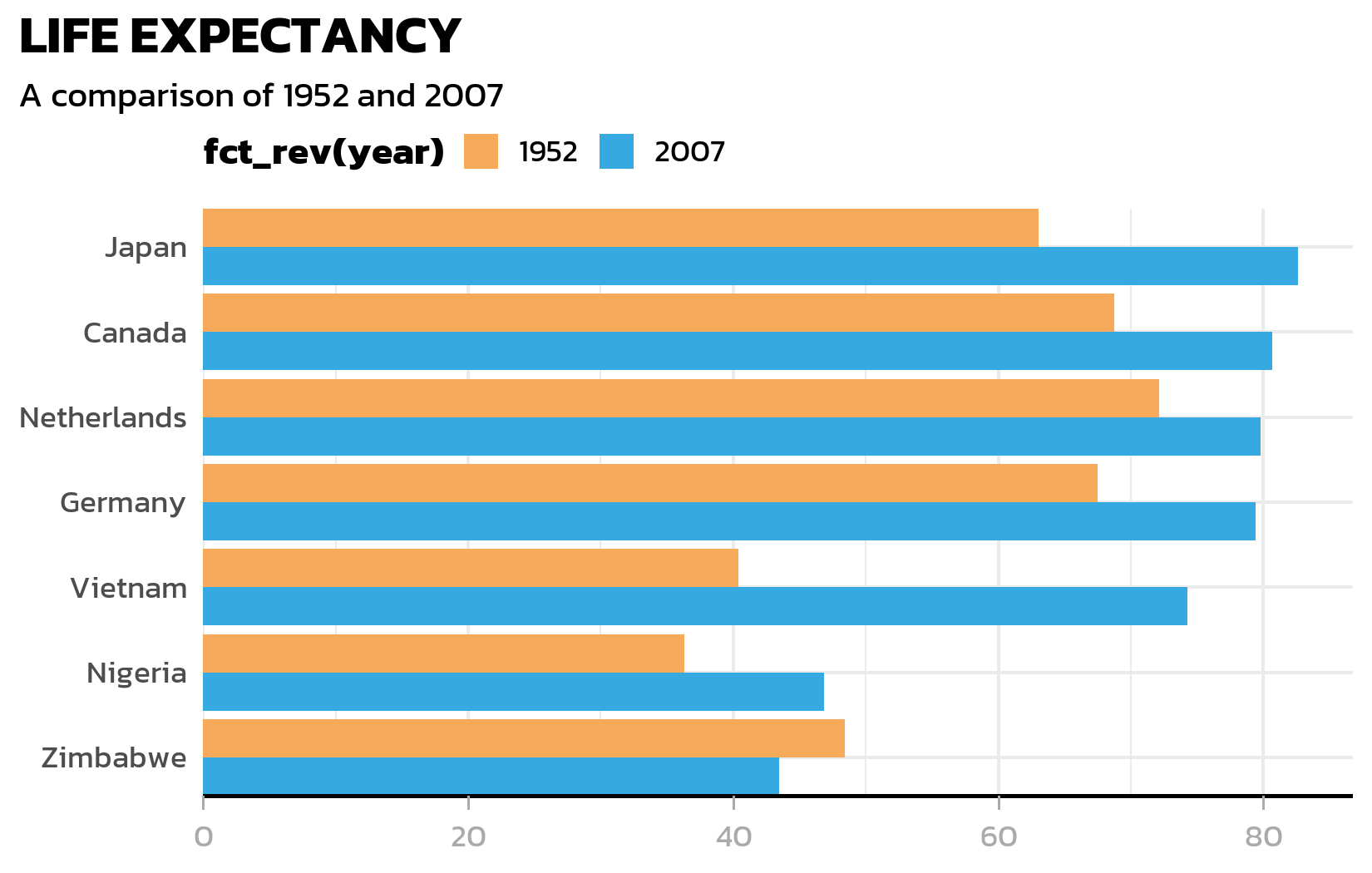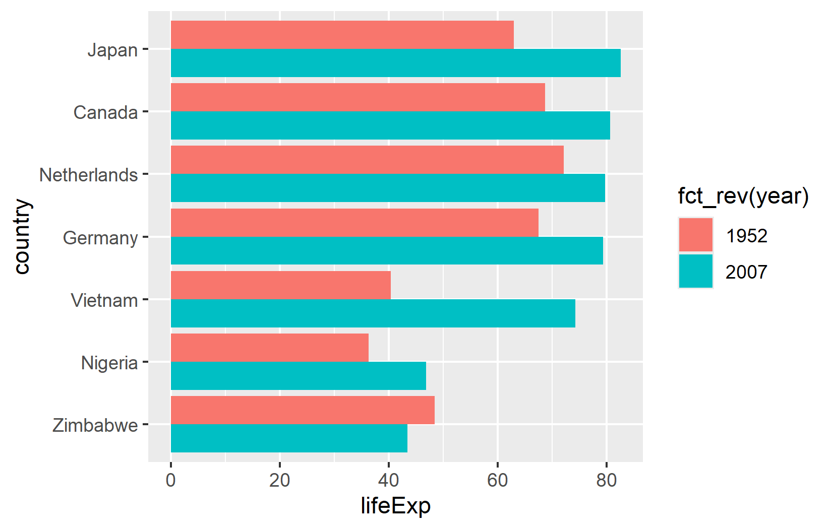scale_fill_discrete(limits = c("1952", "2007"))There are two details worth noting here. First, fct_rev(year) reverses the year factor so that 2007 bars appear above 1952 bars within each country group - matching the intuitive “newer on top” expectation. Second, limits = c("1952", "2007") in the scale ensures the legend shows 1952 before 2007 (chronological order), regardless of how the factor levels are internally ordered.