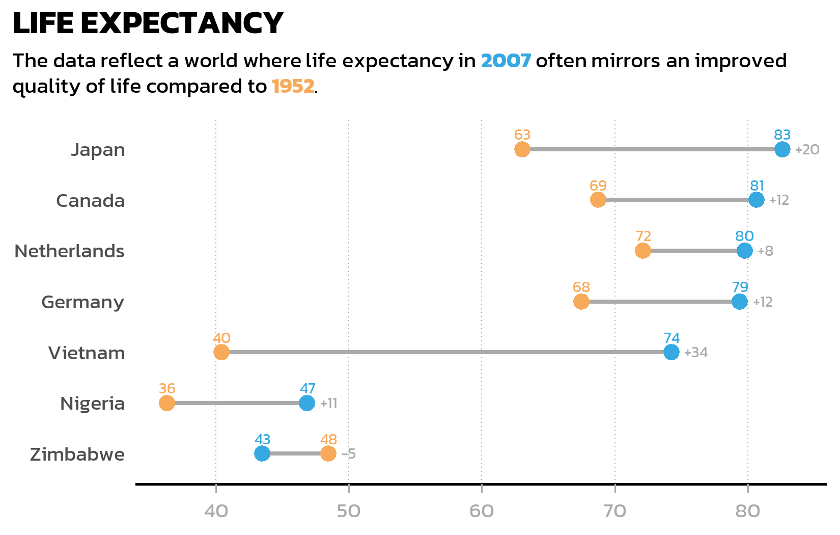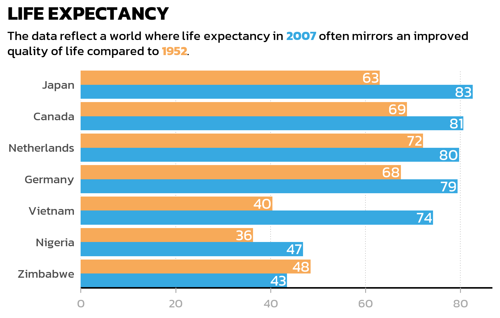 long_subtitle <- "The data reflect a world where life expectancy in <b style='color:#37A9E1;'>2007</b> often mirrors an improved quality of life compared to <b style='color:#F7AA59;'>1952</b>."