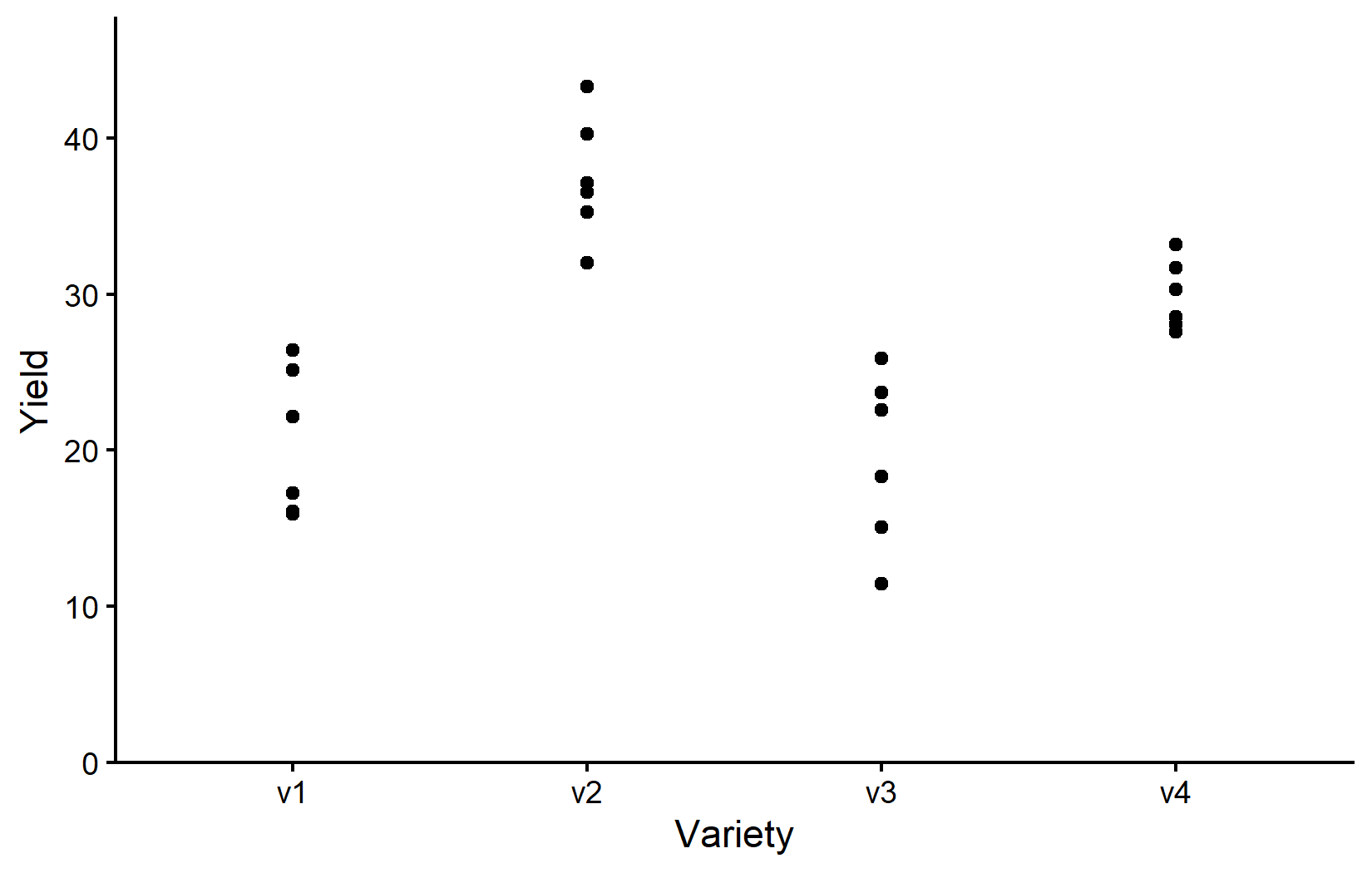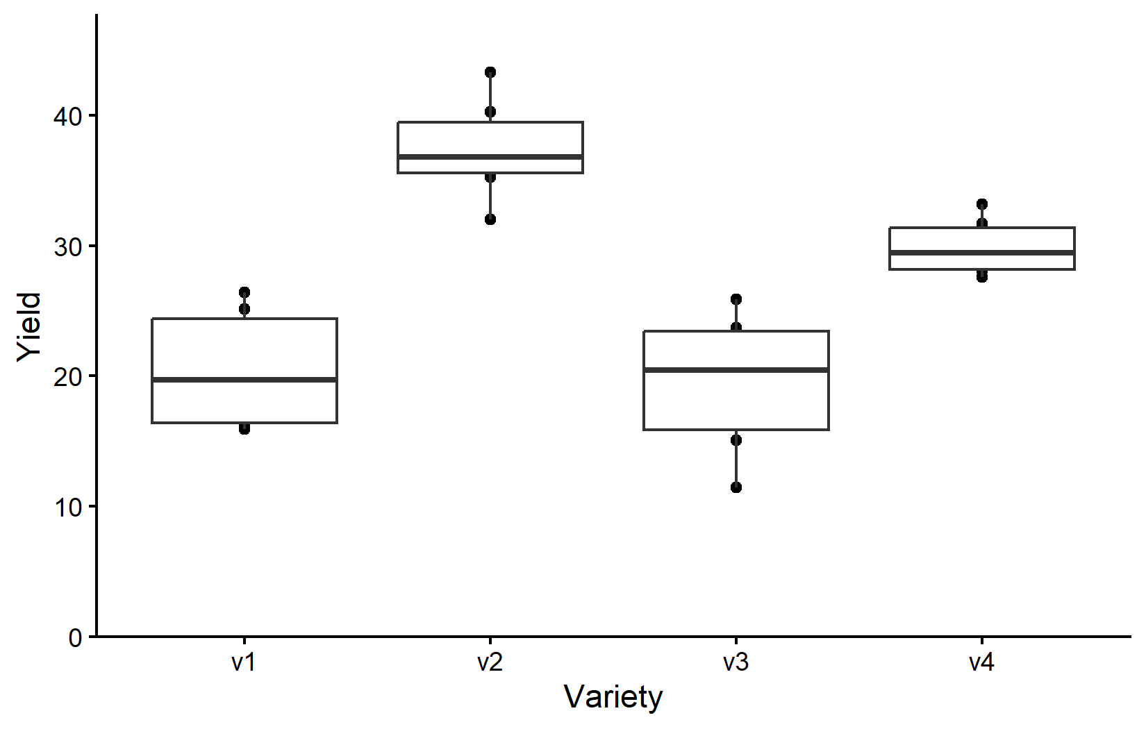 Apparently, variety v2 has the highest mean yield, followed by v4, v1, and v3. Even the lowest value of v2 is higher than all values of v1 and v3. Let’s also visualize the data: