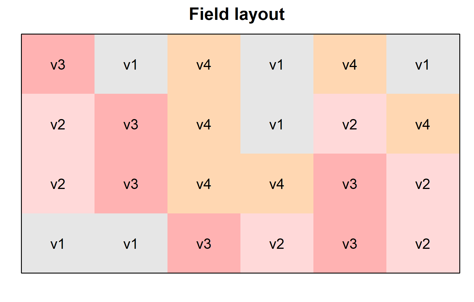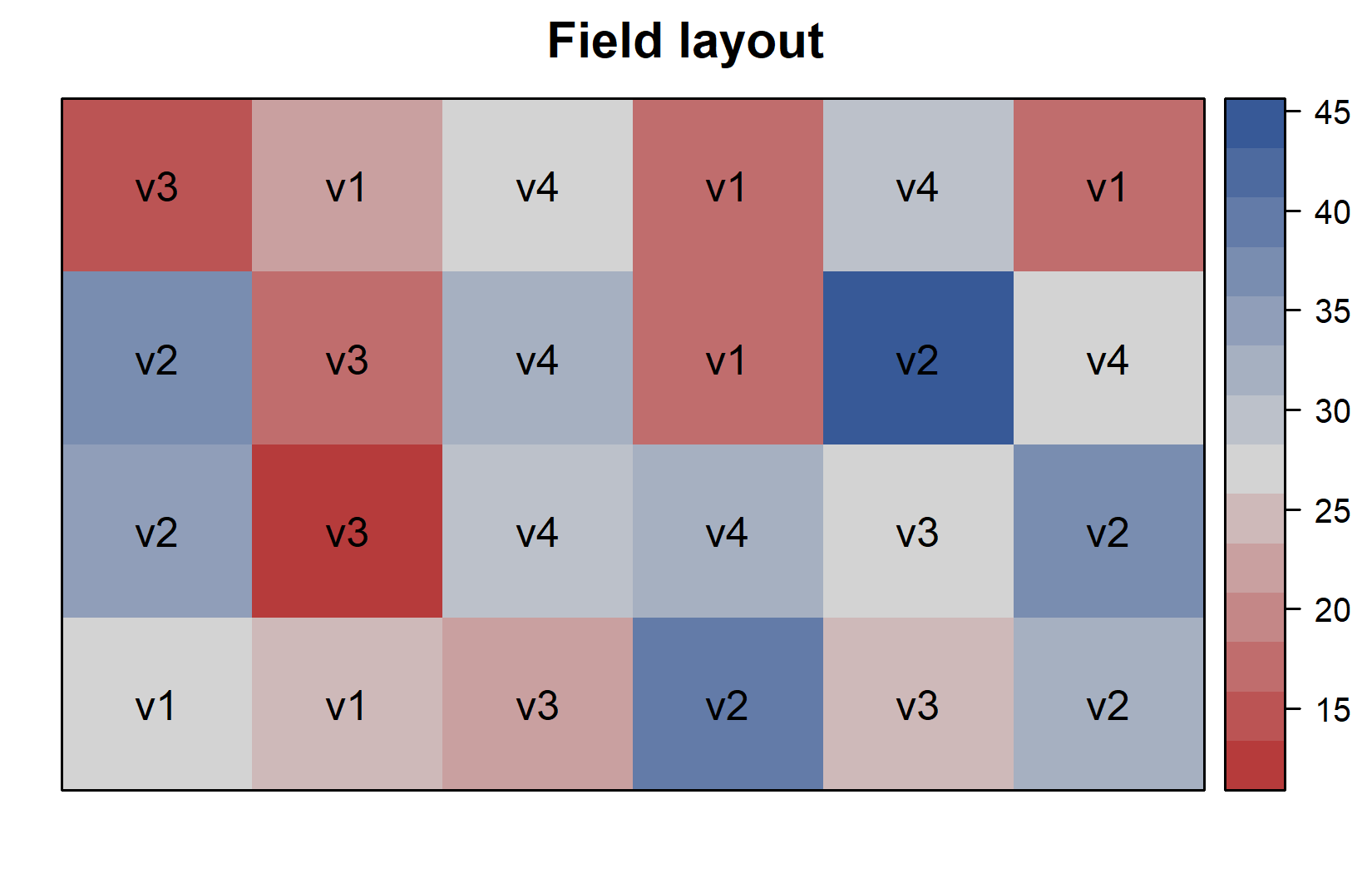 • row and col: The row and column coordinates of each plot in the field layout. This information is not necessary for the analysis, but only required if you want to plot a field plan using desplot() (see below)