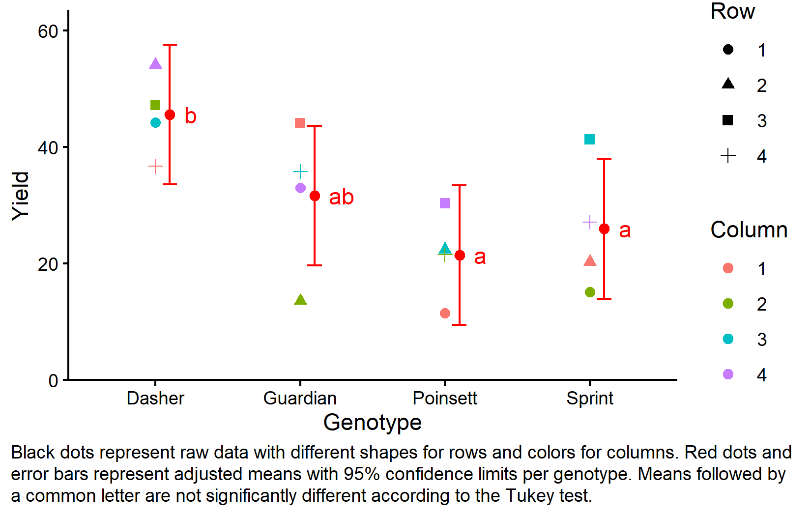 Varieties that share the same letter in the .group column are not significantly different from each other. For example, varieties that both have the letter “a” are not significantly different from each other. Thus, this display is compact because it displays the general findings of all our six tukey tests (statistically significant or not) via a short combination of letters next to our four mean values.