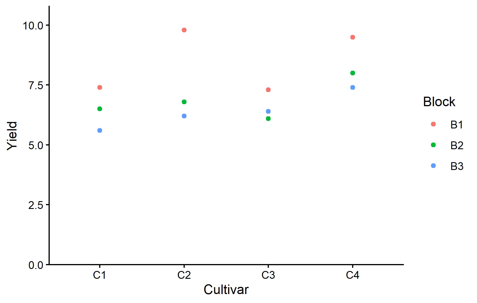 - Within each block, cultivar C4 has either the highest or second highest yield compared to the other cultivars