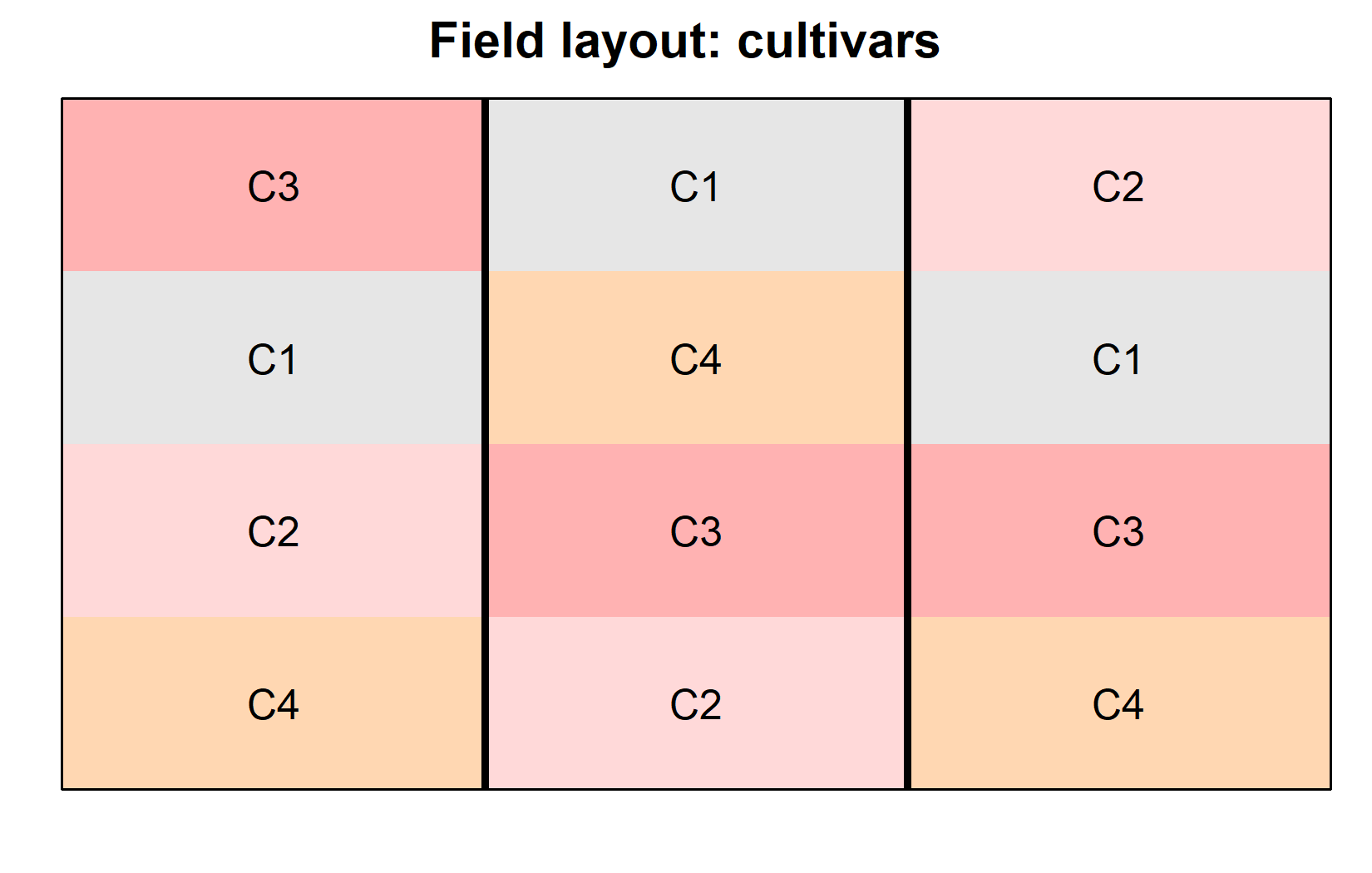 main = "Field layout: cultivars", # plot title