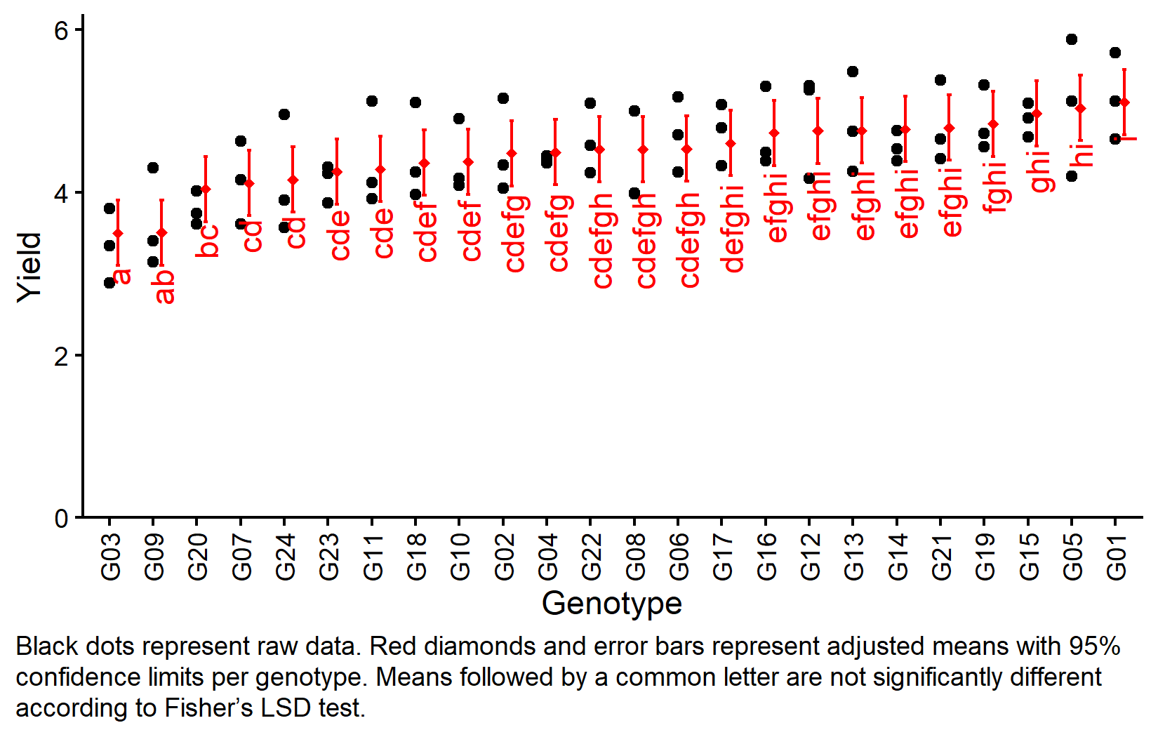 my_caption <- "Black dots represent raw data. Red diamonds and error bars represent adjusted means with 95% confidence limits per genotype. Means followed by a common letter are not significantly different according to Fisher's LSD test."