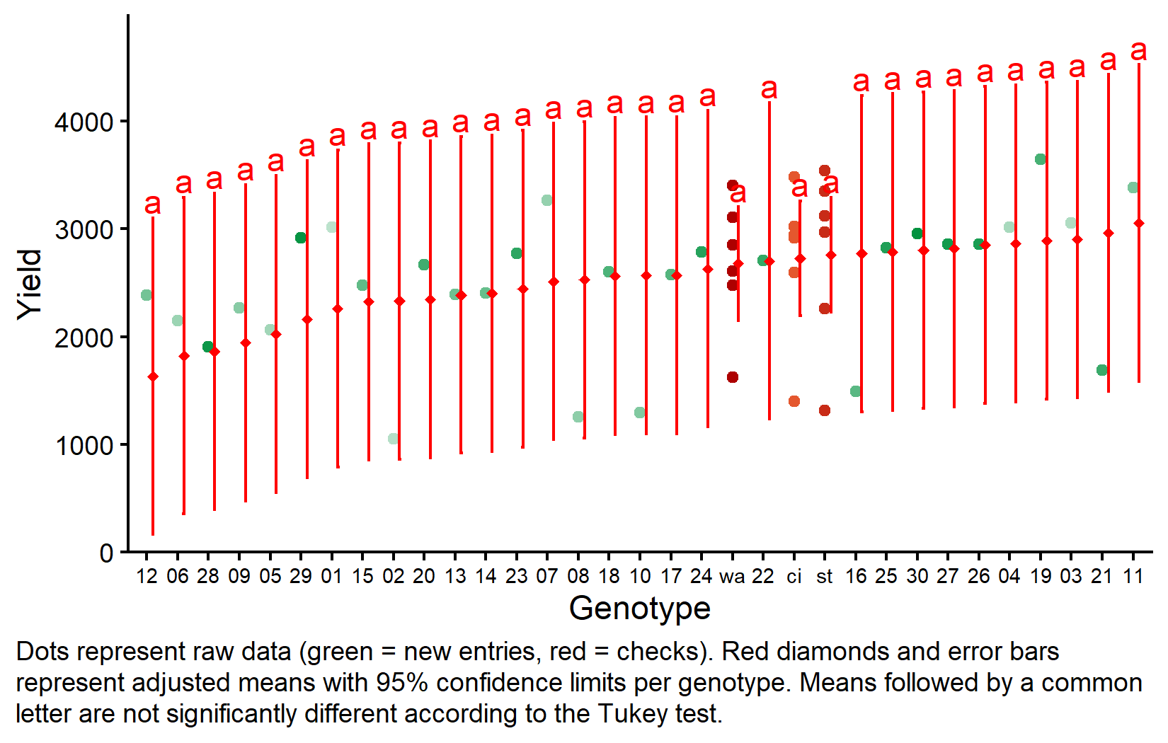 my_caption <- "Dots represent raw data (green = new entries, red = checks). Red diamonds and error bars represent adjusted means with 95% confidence limits per genotype. Means followed by a common letter are not significantly different according to the Tukey test."