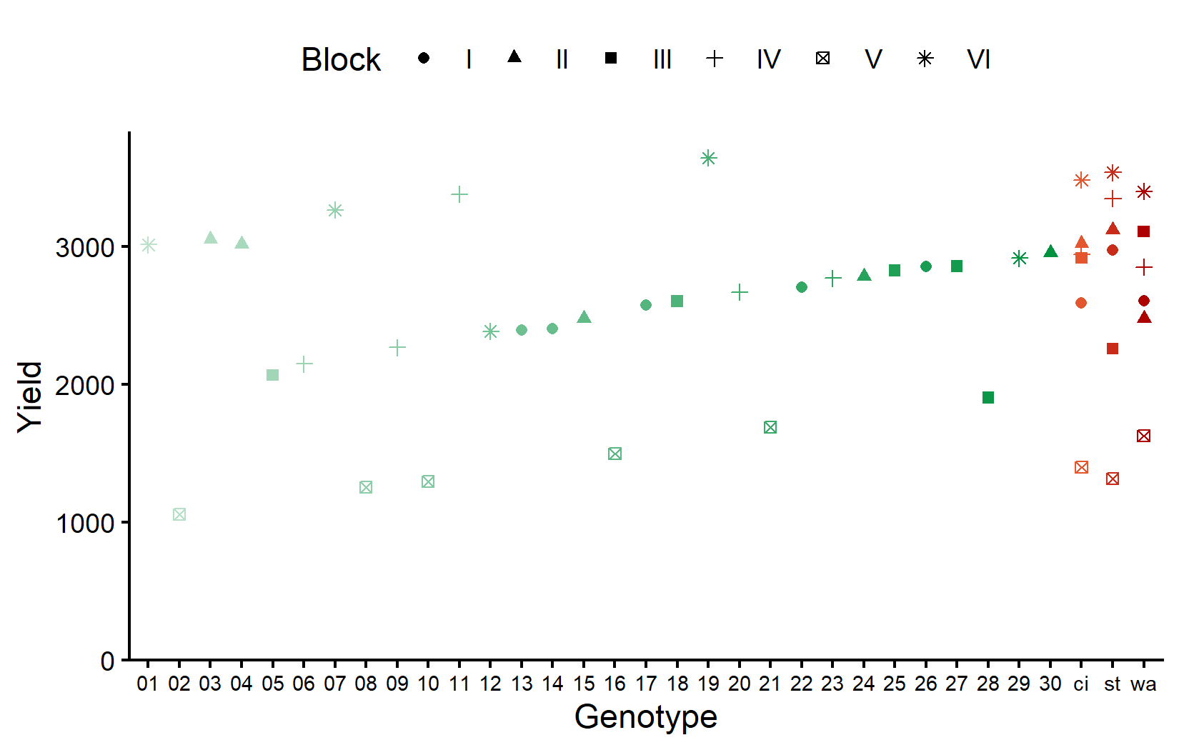 We can see variation among blocks. Block II has the highest mean yield, while Block V has the lowest. Let’s visualize the data with different colors for checks and new entries: