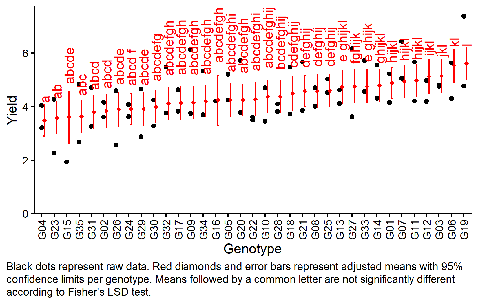 my_caption <- "Black dots represent raw data. Red diamonds and error bars represent adjusted means with 95% confidence limits per genotype. Means followed by a common letter are not significantly different according to Fisher's LSD test."