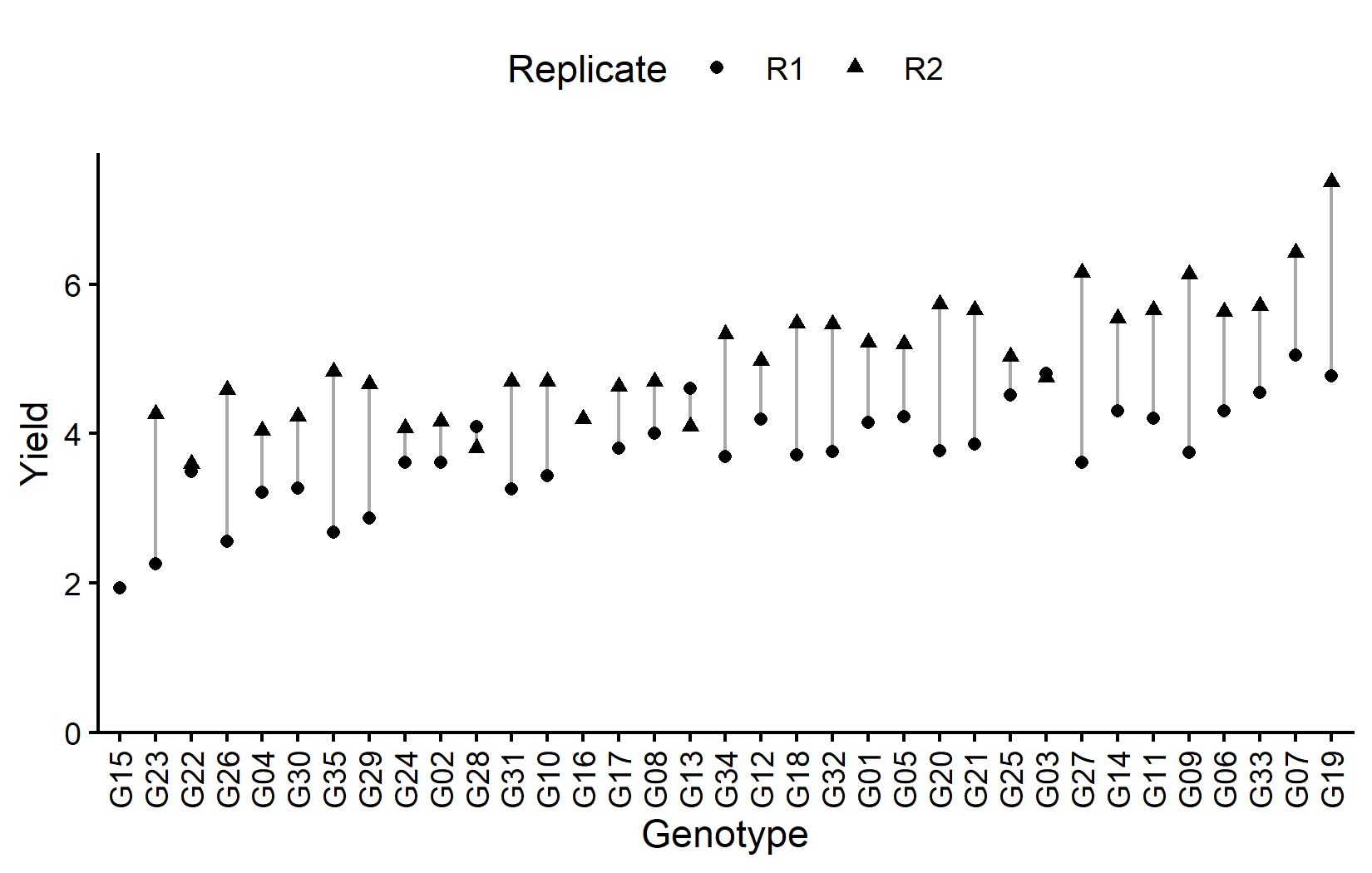 Most genotypes appear twice (once per replicate), but some have only one observation due to missing data. Let’s visualize the data: