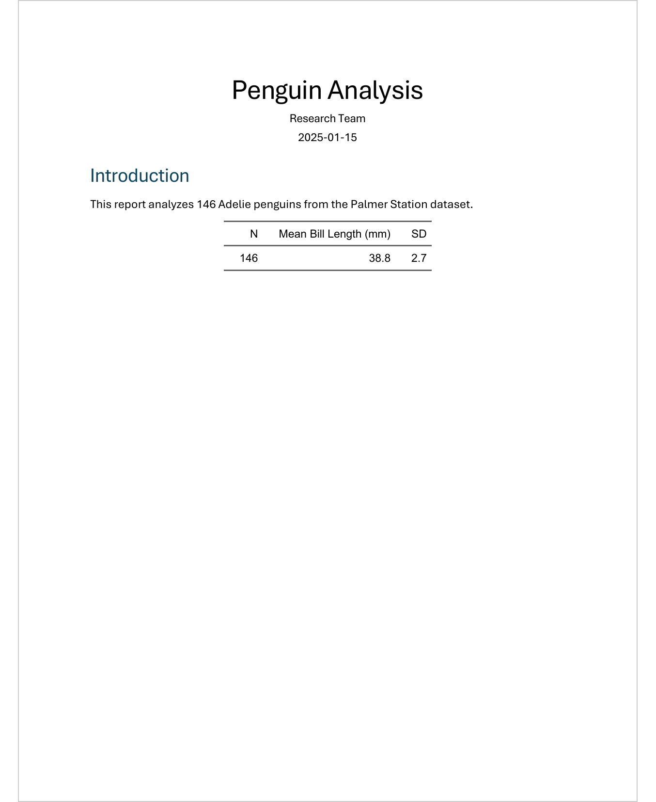 When rendered to Word, only the text and the formatted table appear - no code, no messages: