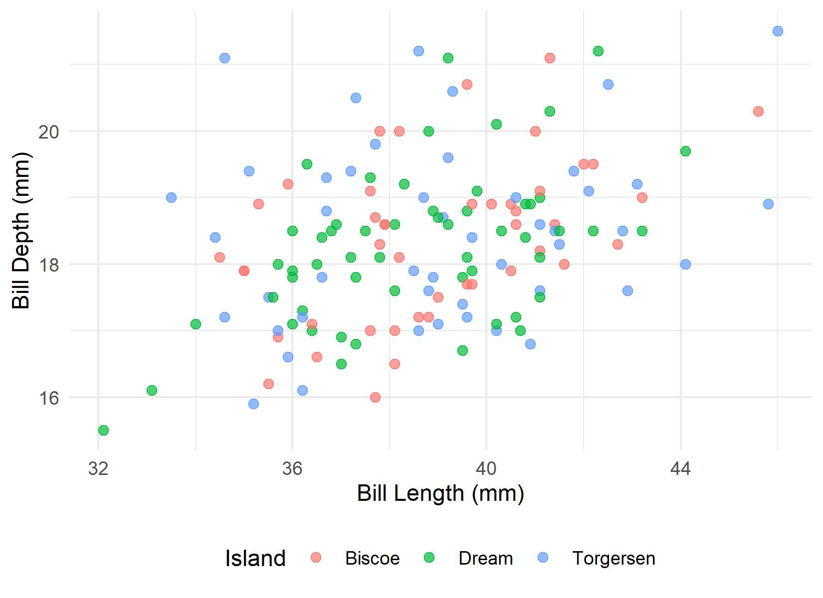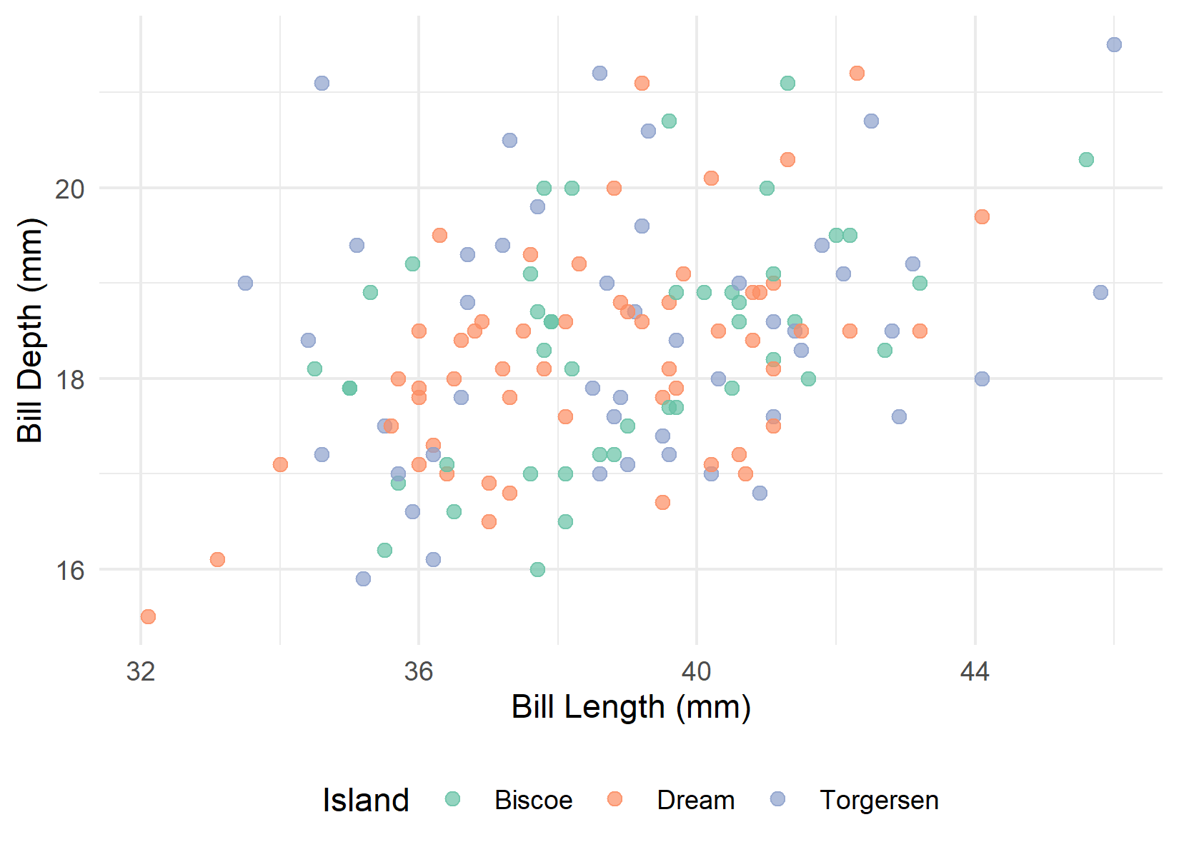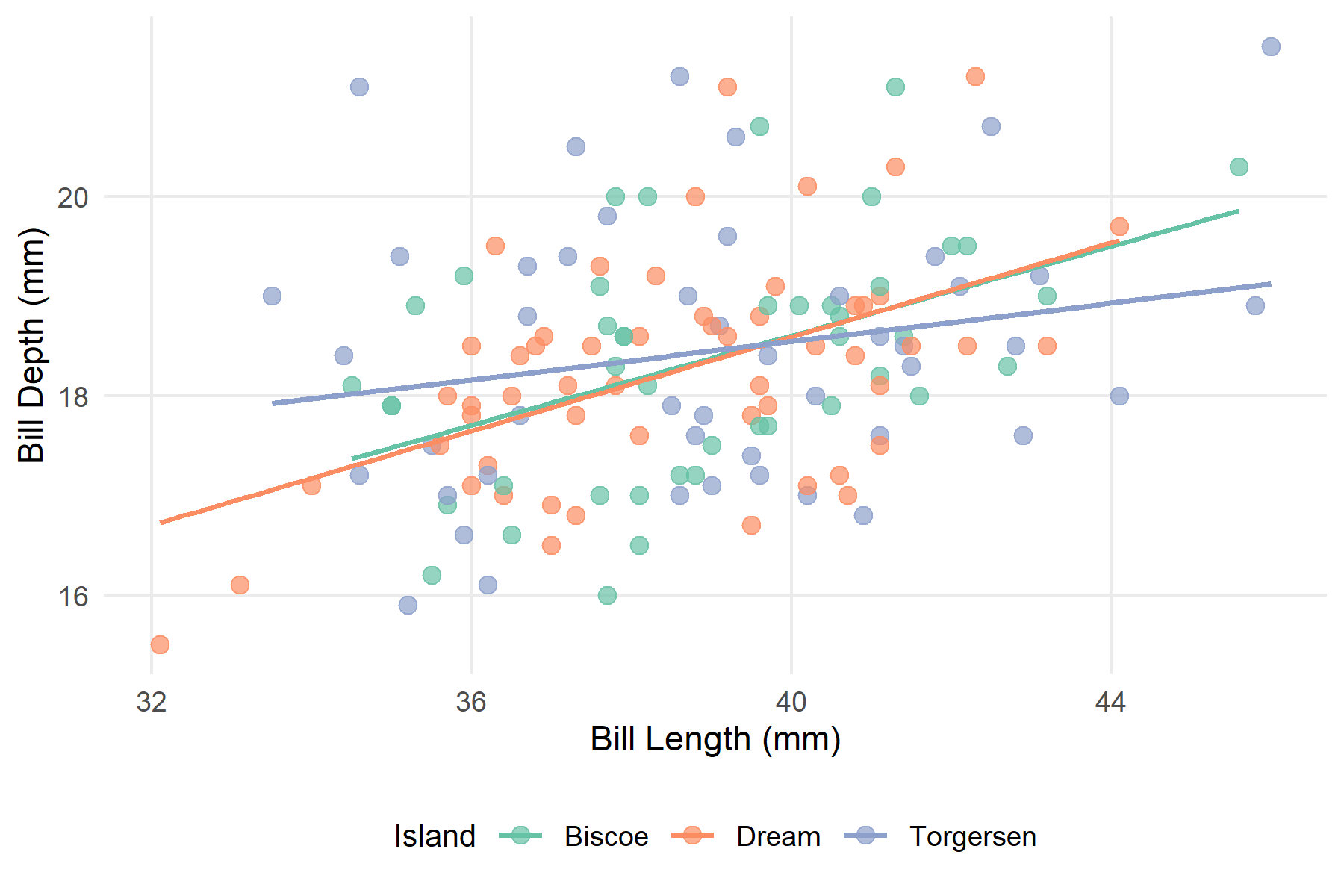 Figure 2: Relationship between bill length and bill depth in Adelie penguins, grouped by island. Each point represents an individual.