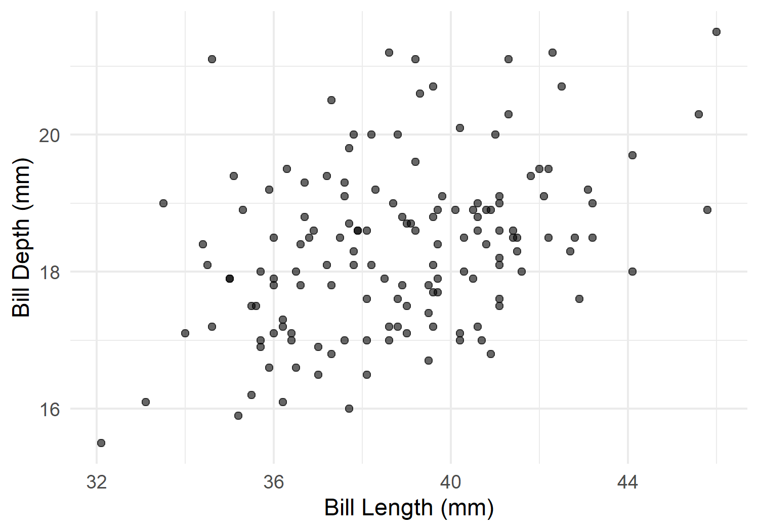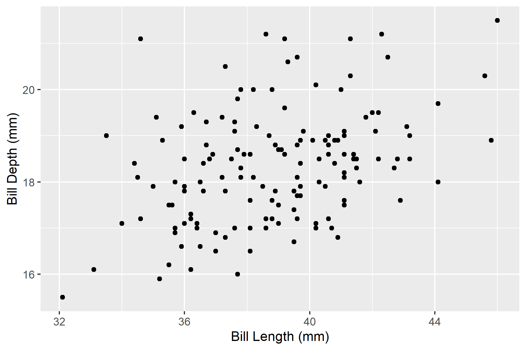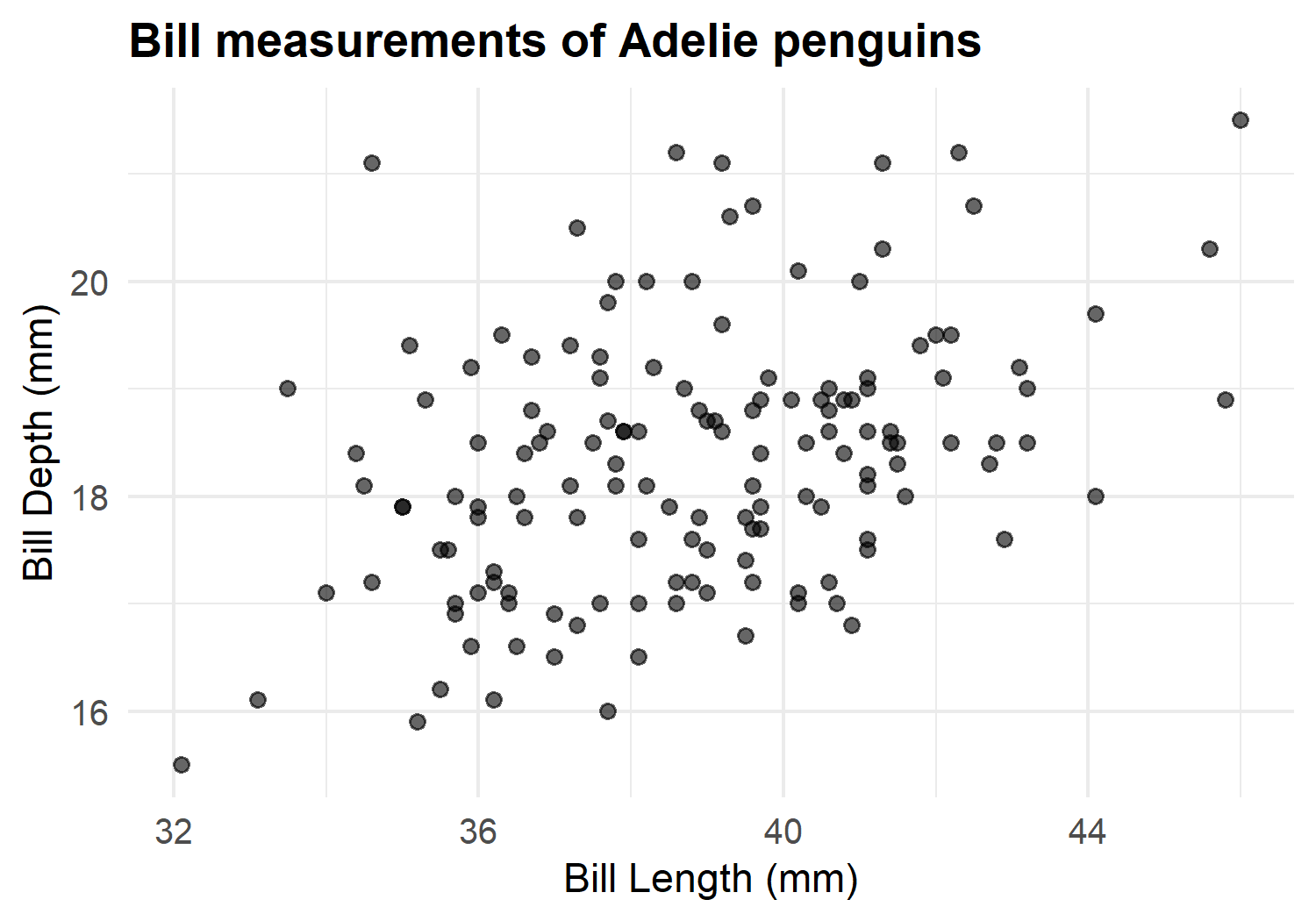 p <- ggplot(adelie, aes(x = bill_length_mm, y = bill_depth_mm)) +