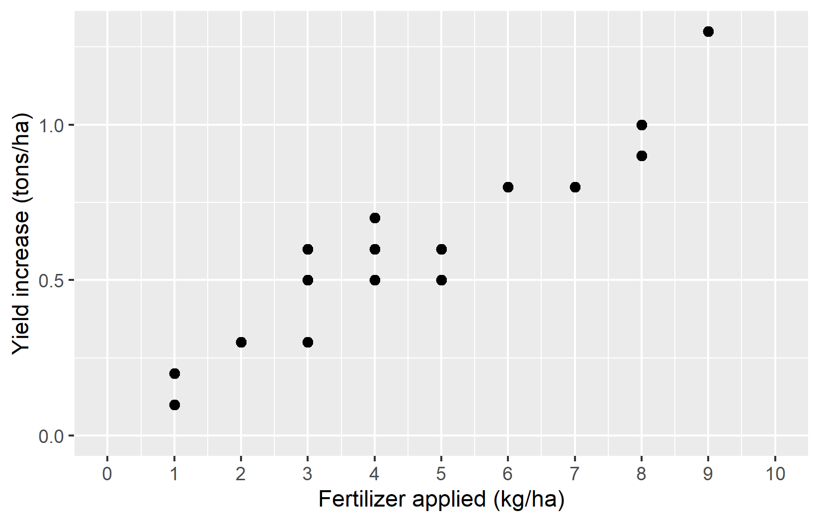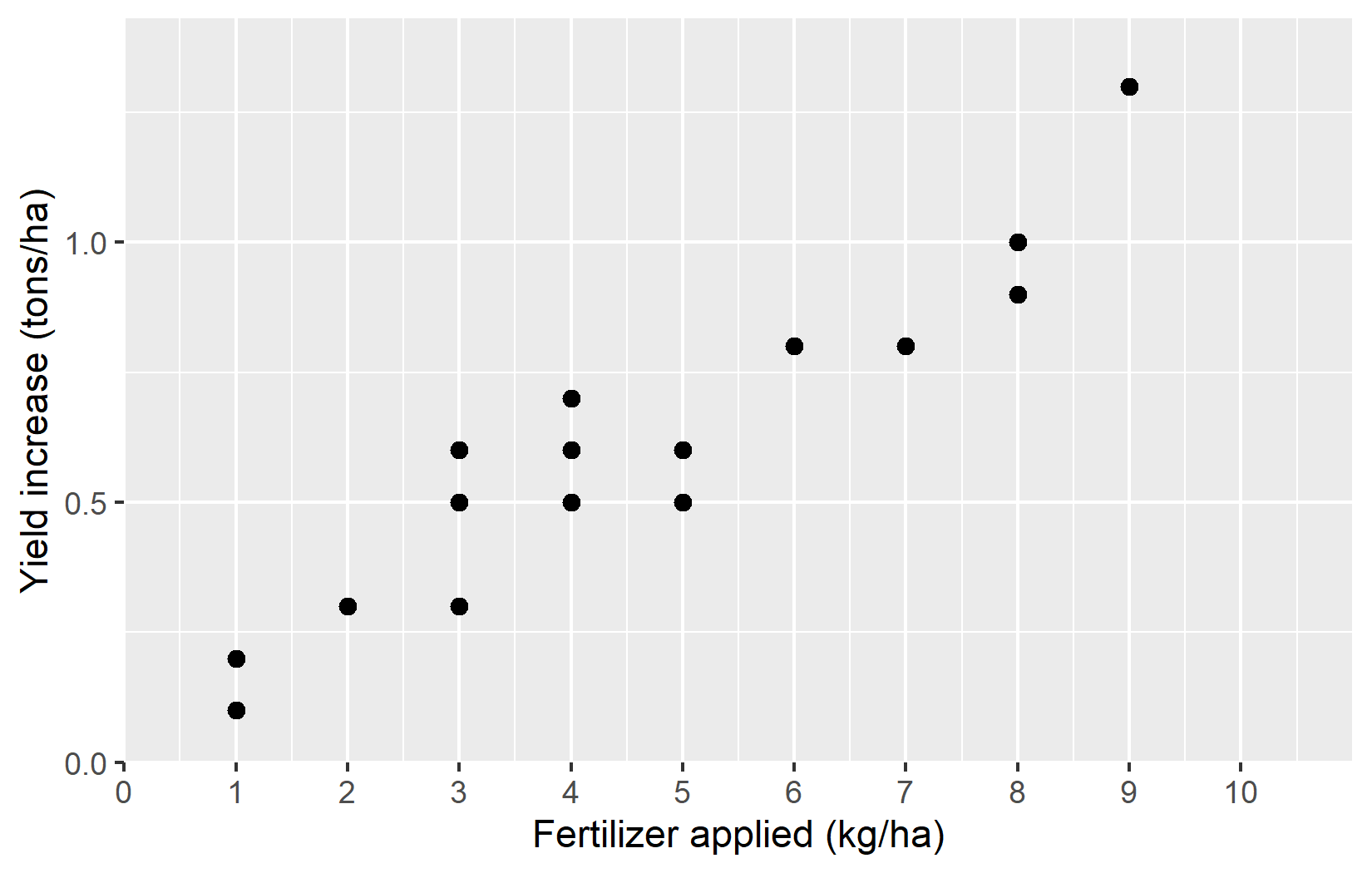 For this specific plot, one could argue that it does not make sense to show values below 0 - at least for the applied fertilizer, since it is not possible to apply a negative amount of fertilizer. However, even after setting the lower limit to 0, ggplot adds a bit of extra space below that limit. To prevent this default behaviour, we can use the expand argument. While we could just set expand = c(0, 0) to remove all extra space - both below the lower limit and above the upper limit - this not an elegant solution, as it would then no longer be enough space at the upper limit. Instead, using expand = expansion(mult = c(0, 0.1)) is usually a better solution, as it will add 0% extra space at the lower limit and 10% extra space at the upper limit. This way, we can ensure that the plot looks balanced and visually appealing. And while expand = expansion(mult = c(0, 0.1)) may seem cryptic, the good thing about is that it can be copy-pasted to other plots with the same issue of wanting no extra space below 0.
