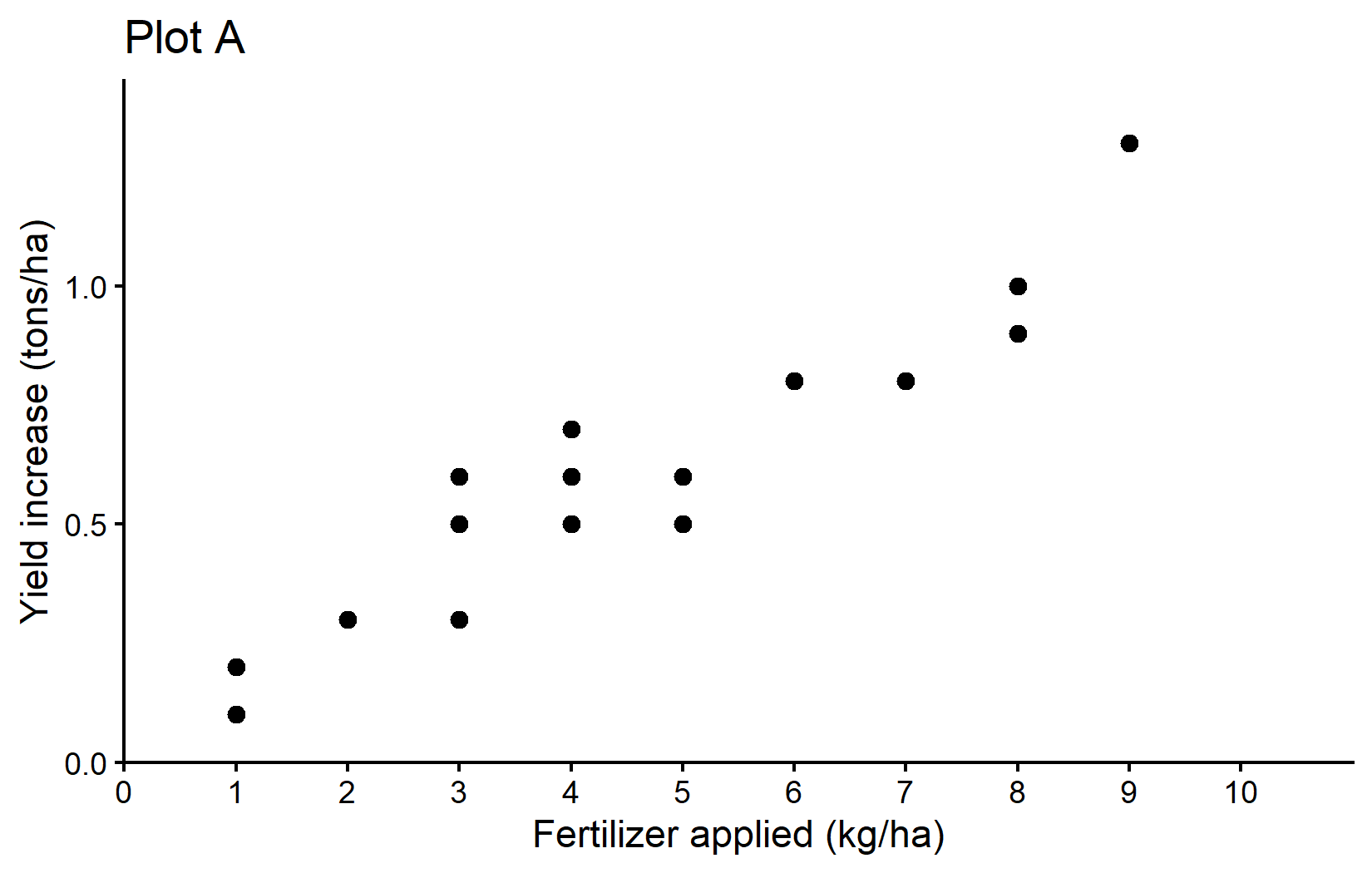 Let’s create the first plot from the Correlation & Regression chapter, which shows the relationship between fertilizer application and yield increase as a scatter plot.