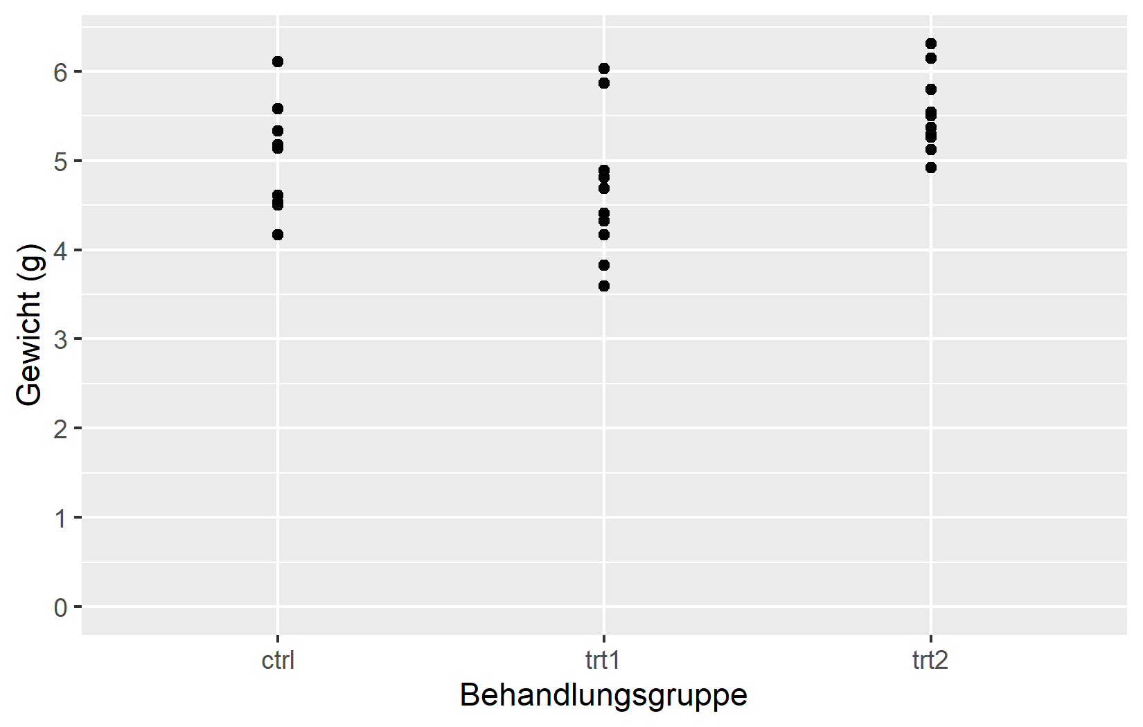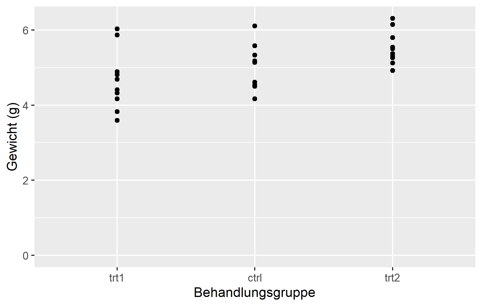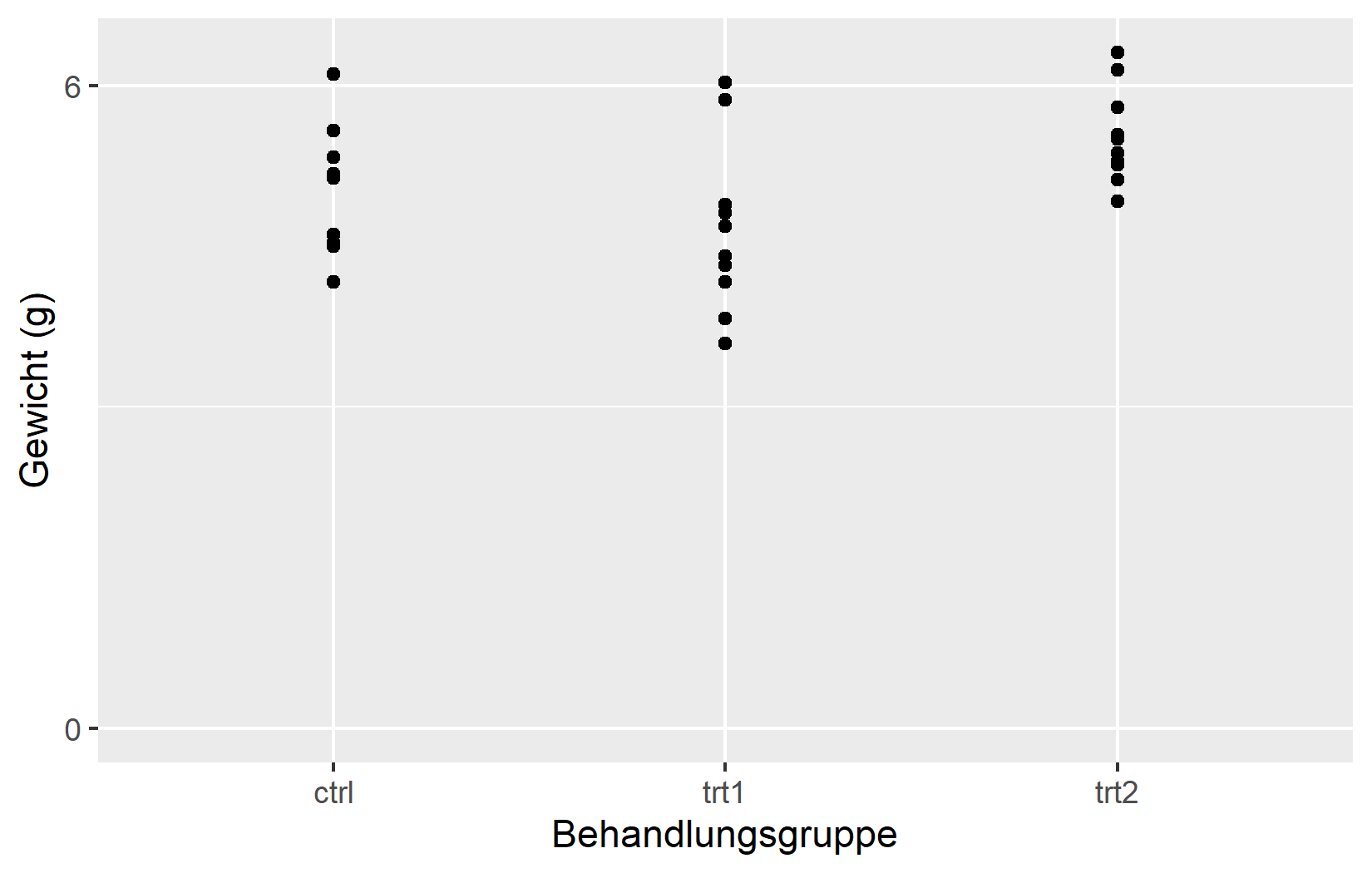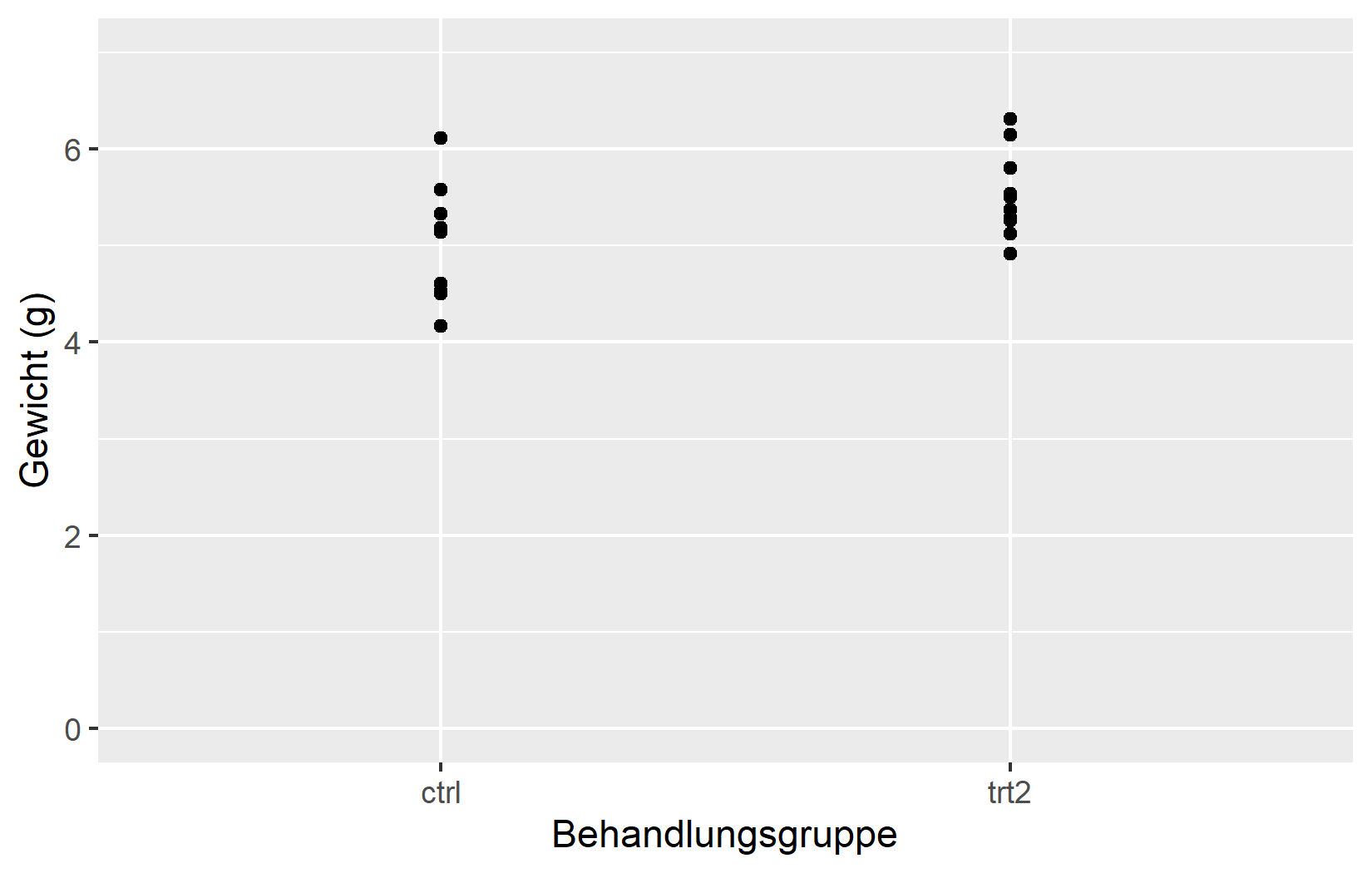 Die einfachste Anpassung ist der Achsentitel. Standardmaessig verwendet ggplot2 den Spaltennamen aus den Daten - in unserem Fall weight und group. Fuer explorative Arbeit ist das in Ordnung, aber fuer jede geteilte Ausgabe sollte man aussagekraeftige Titel mit Einheiten angeben. Das Argument name erledigt genau das: