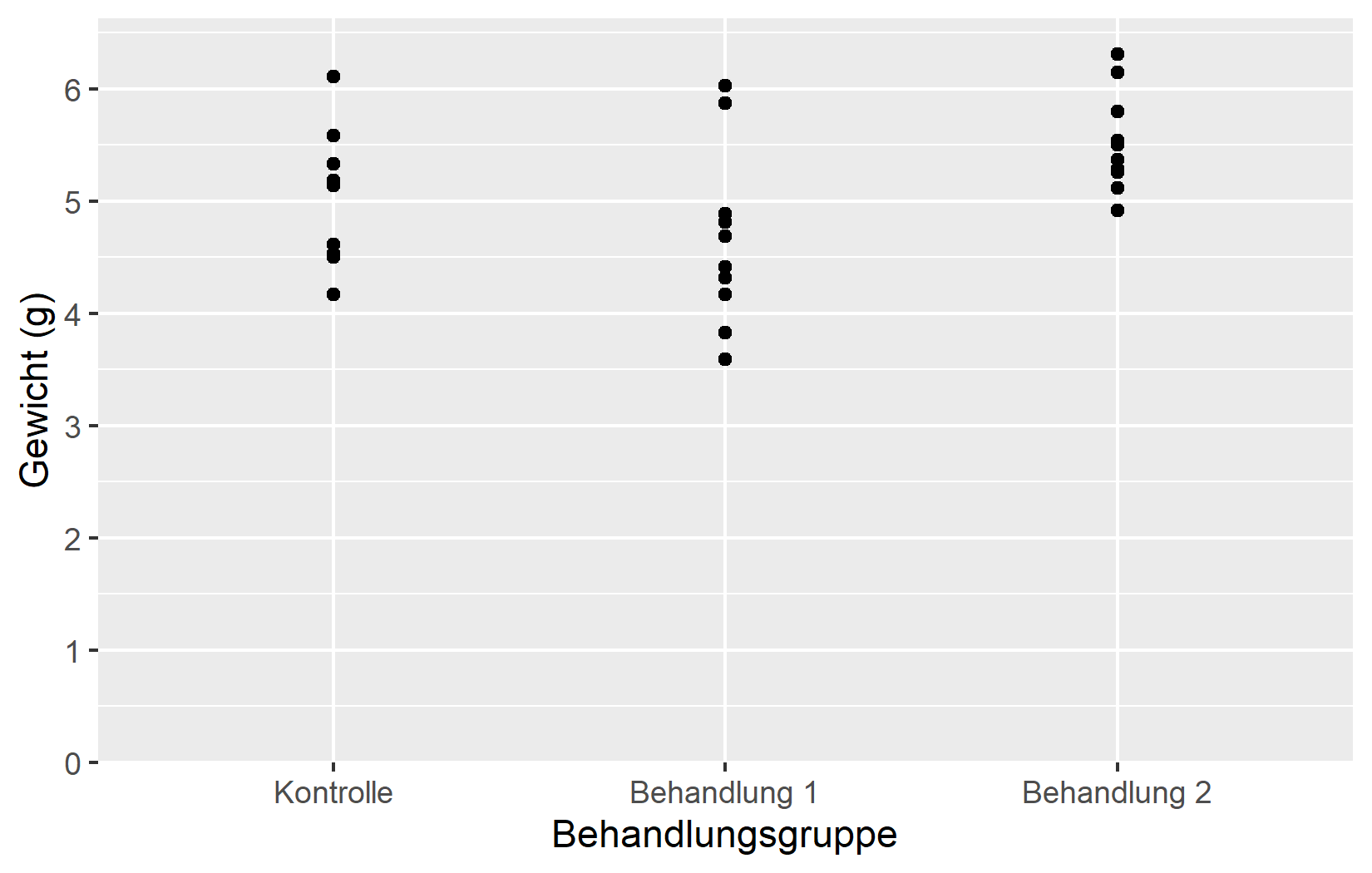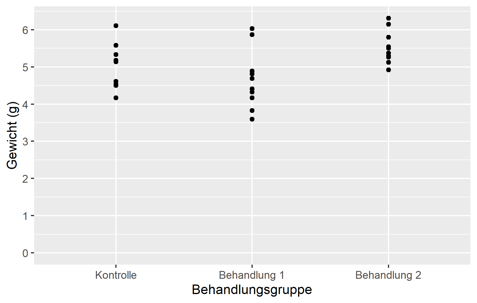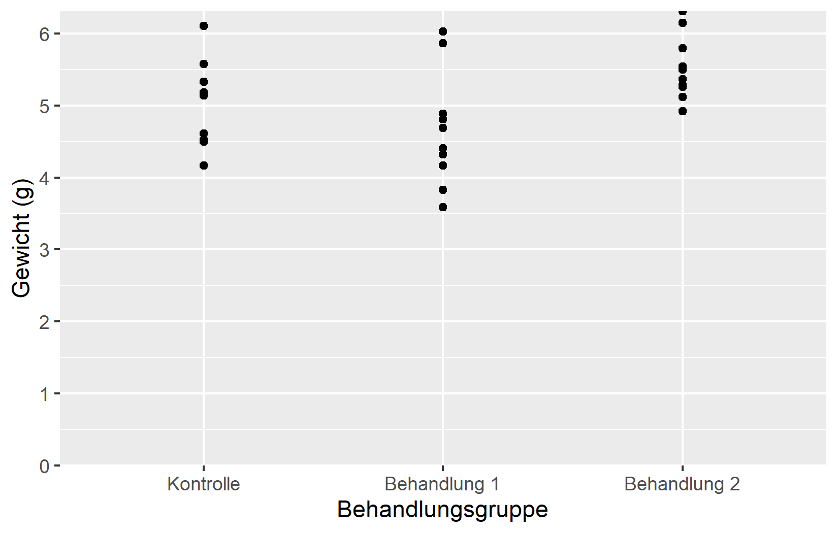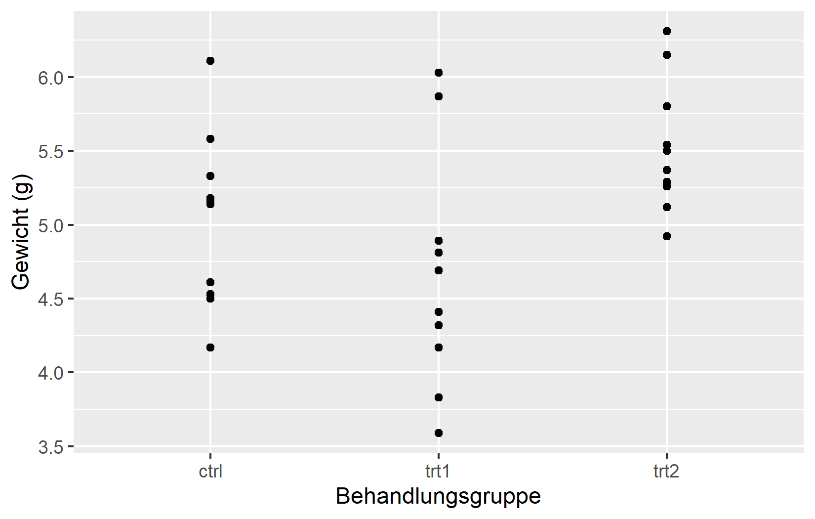 Die einfachste Anpassung ist der Achsentitel. Standardmaessig verwendet ggplot2 den Spaltennamen aus den Daten - in unserem Fall weight und group. Fuer explorative Arbeit ist das in Ordnung, aber fuer jede geteilte Ausgabe sollte man aussagekraeftige Titel mit Einheiten angeben. Das Argument name erledigt genau das: