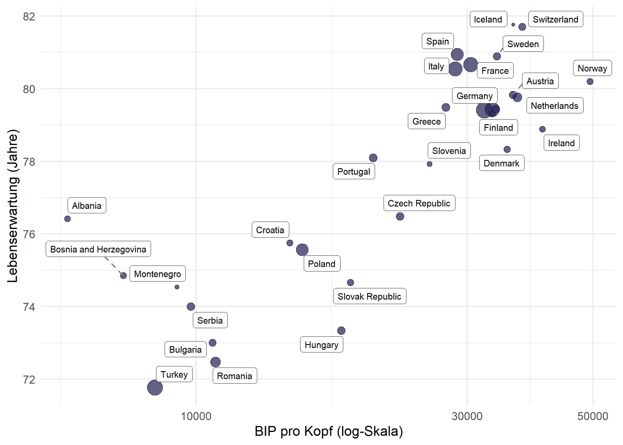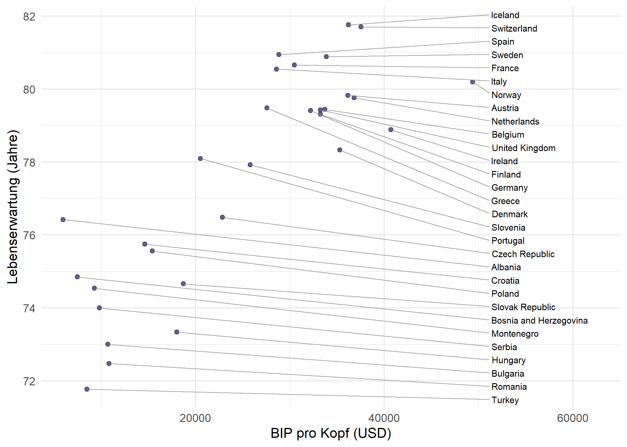Da das Labeln aller 142 Laender auf einmal selbst mit Repulsion ueberfordernd wirkt, ist eine Filterung auf einen einzelnen Kontinent (hier Europa mit 30 Laendern) fuer geom_label_repel() deutlich effektiver.