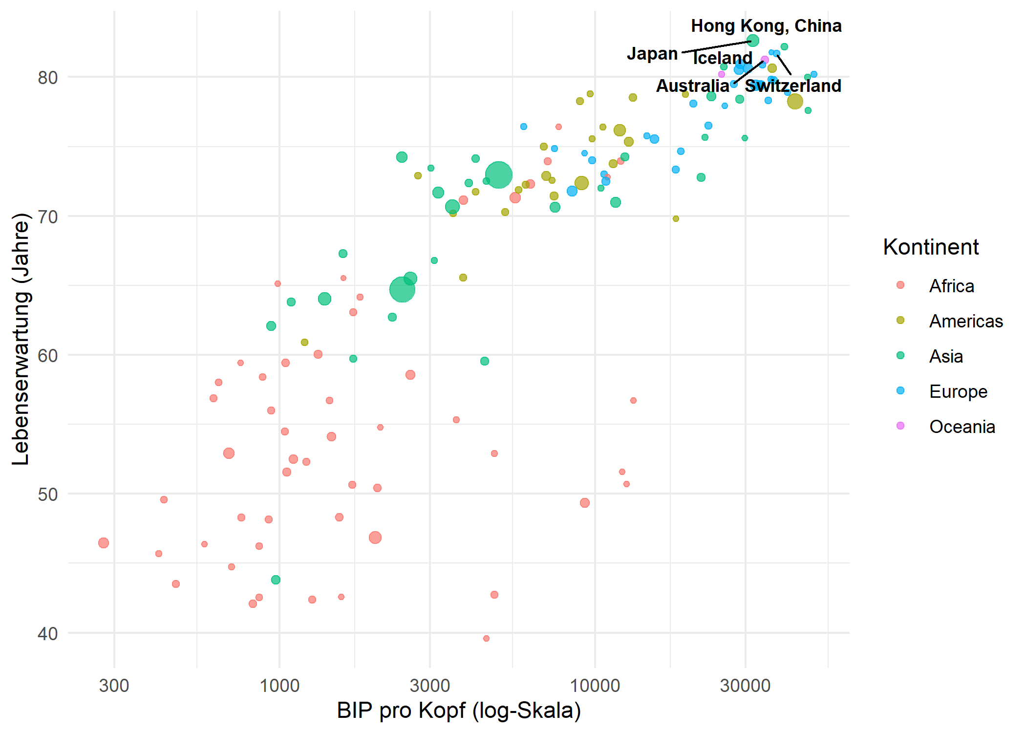 In vielen Situationen ist es weder noetig noch wuenschenswert, jeden Punkt zu beschriften. Eine gaengige Strategie besteht darin, nur die interessantesten Beobachtungen zu beschriften - zum Beispiel die Laender mit der hoechsten Lebenserwartung - und den Rest als unbeschriftete Punkte zu belassen. So bleibt der Plot uebersichtlich und hebt gleichzeitig die wichtigsten Daten hervor.