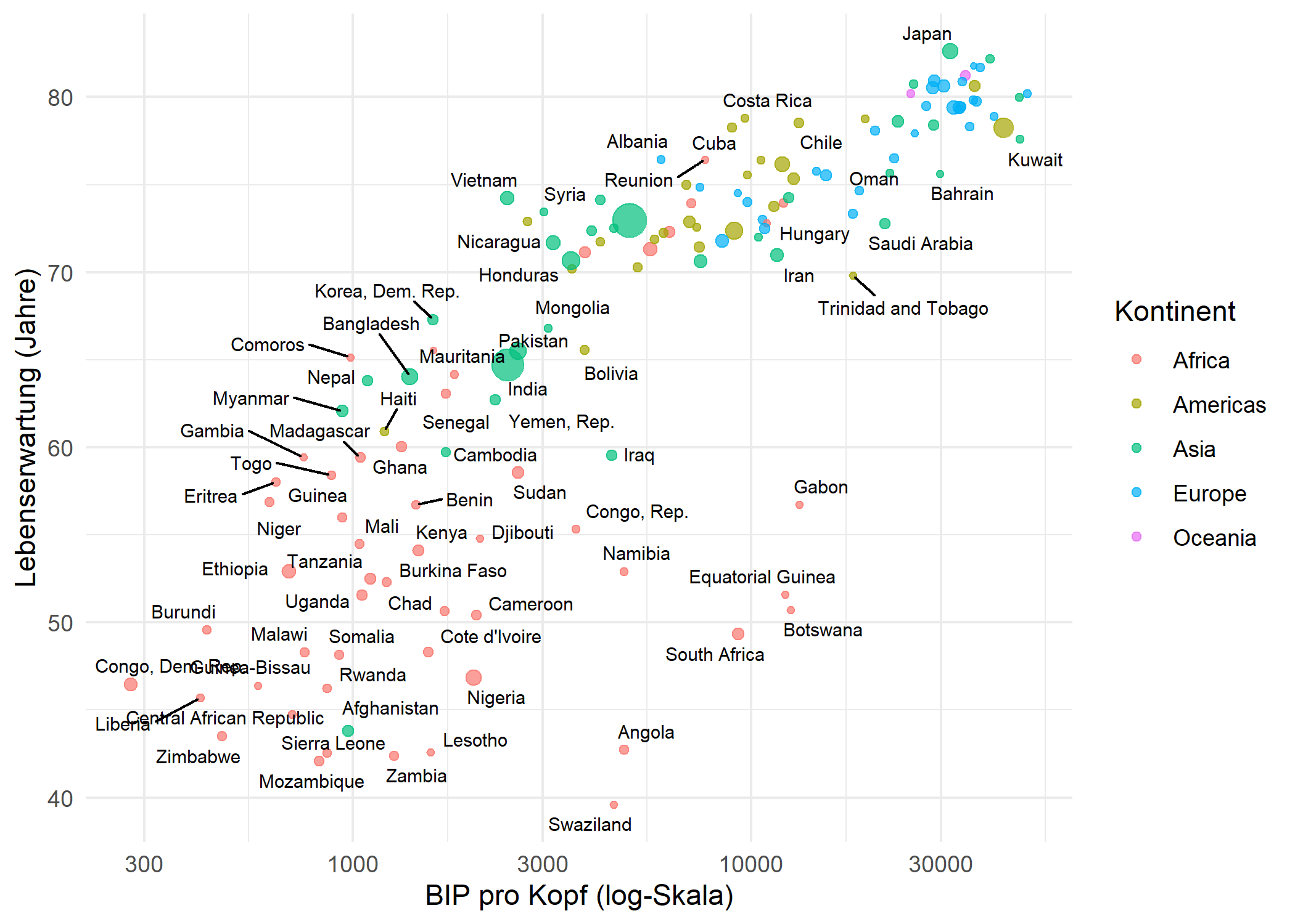 Um das Labeling-Problem zu veranschaulichen, erstellen wir hier ein Streudiagramm mit geom_text() - jeder Laendername wird direkt an seinem Datenpunkt platziert: