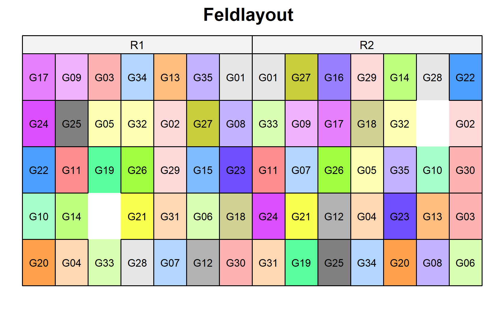Dieses Beispiel betrachtet Daten, die in Kempton, Fox, und Cerezo (1997) veröffentlicht wurden, aus einem Ertragsversuch, der als auflösbares Zeilen-Spalten-Design angelegt wurde. Der Versuch hatte 35 Genotypen (gen), 2 vollständige Wiederholungen (rep) mit jeweils 5 Zeilen (row) und 7 Spalten (col). Somit bildet jede Wiederholung ein 5×7-Raster mit unvollständigen Zeilen und Spalten.