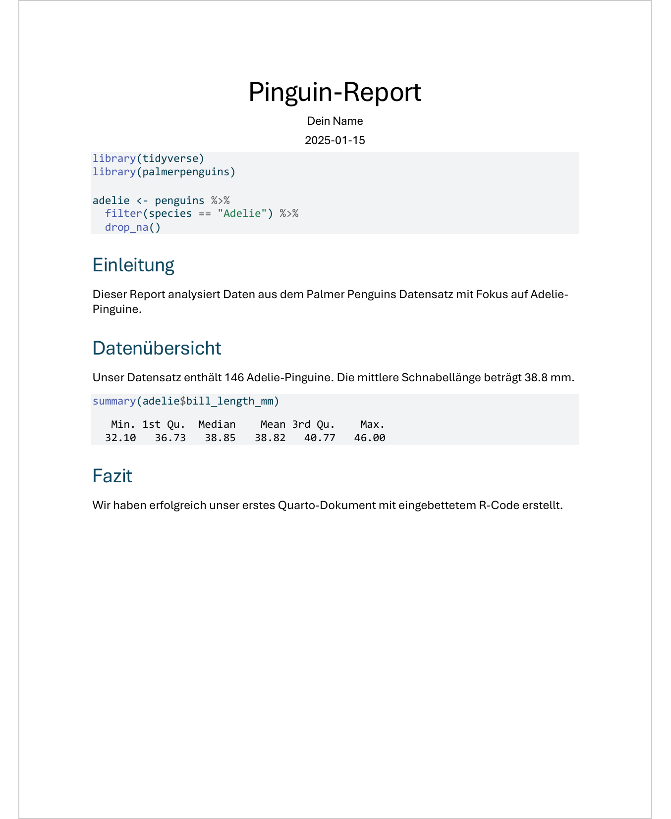Wir haben erfolgreich unser erstes Quarto-Dokument mit eingebettetem R-Code erstellt.