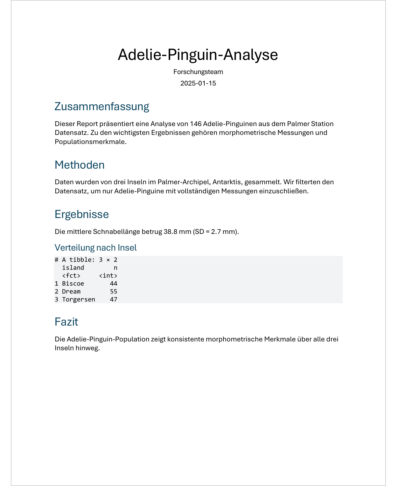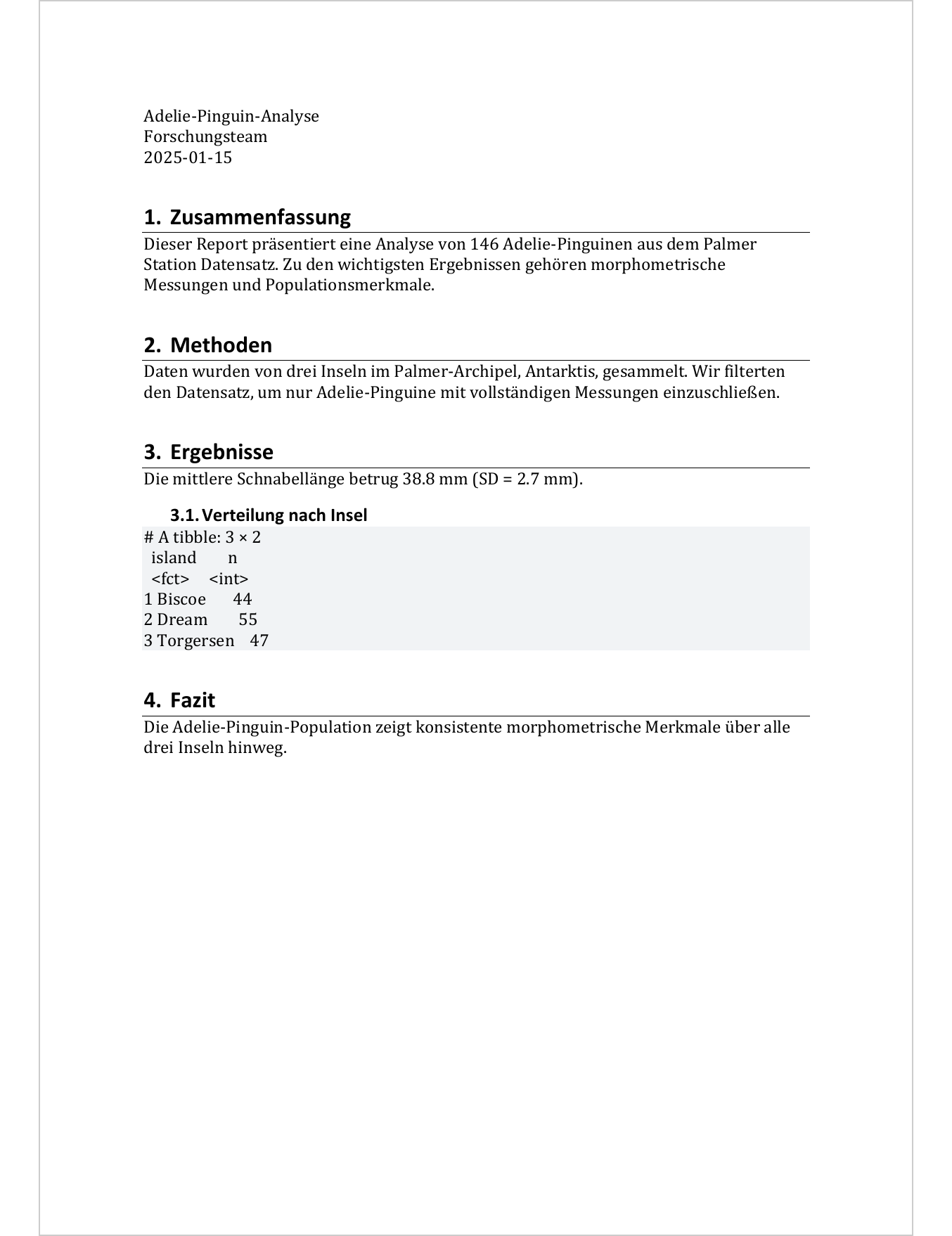 Die Adelie-Pinguin-Population zeigt konsistente morphometrische Merkmale über alle drei Inseln hinweg.Als Word-Dokument gerendert sieht dieses Dokument so aus: