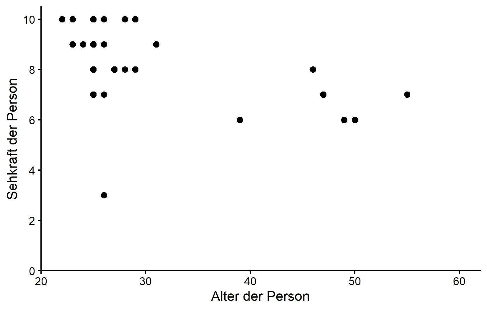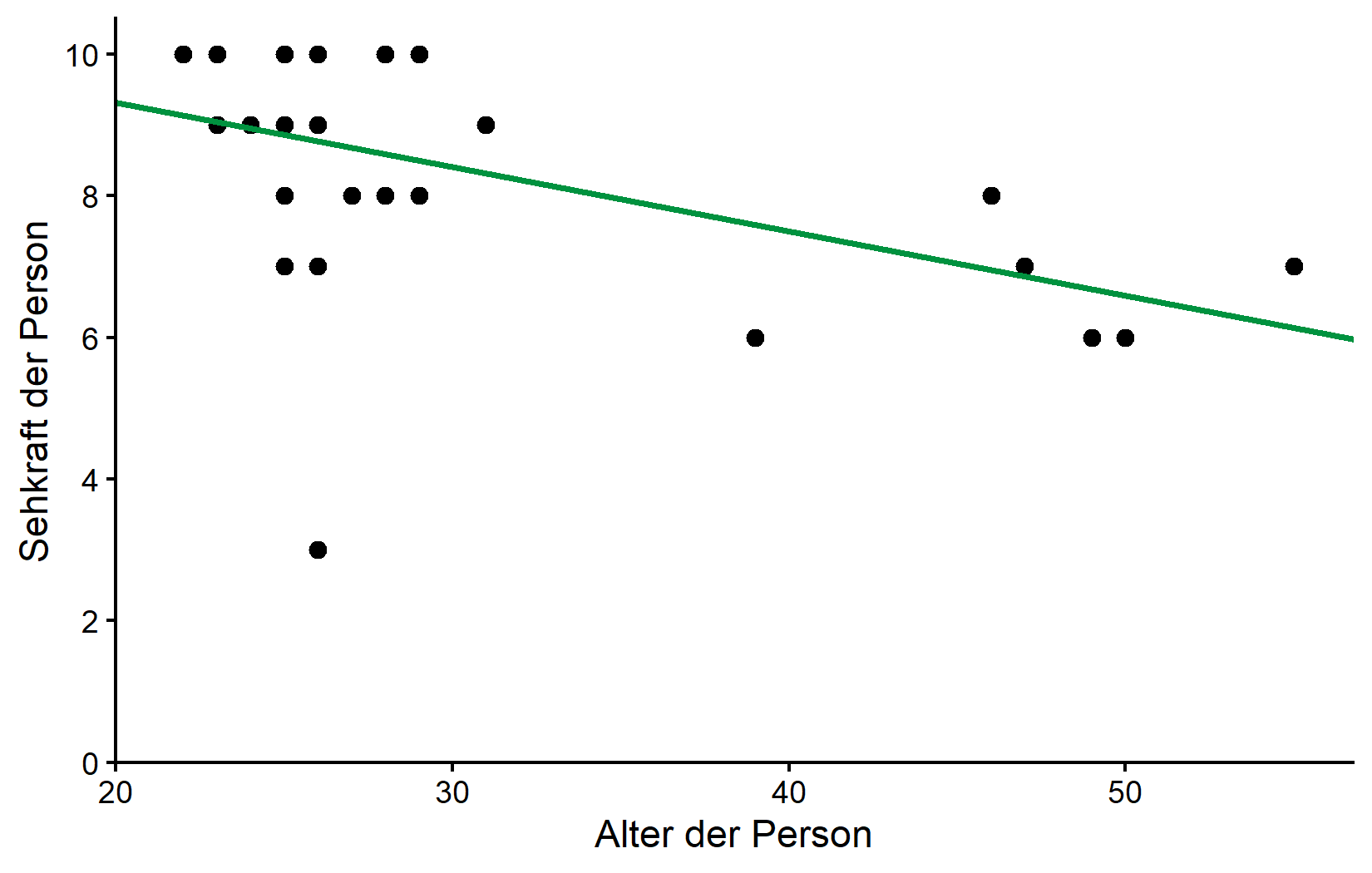 In diesem Kapitel arbeiten wir mit einem Datensatz, der während eines hypothetischen Forschungsprojekts erhoben wurde, bei dem das Alter der Teilnehmer und ihre Sehqualität (auf einer Skala von 1-10) erfasst wurden. Die Daten wurden durch Befragung von 29 Personen auf einem Universitätscampus gesammelt.