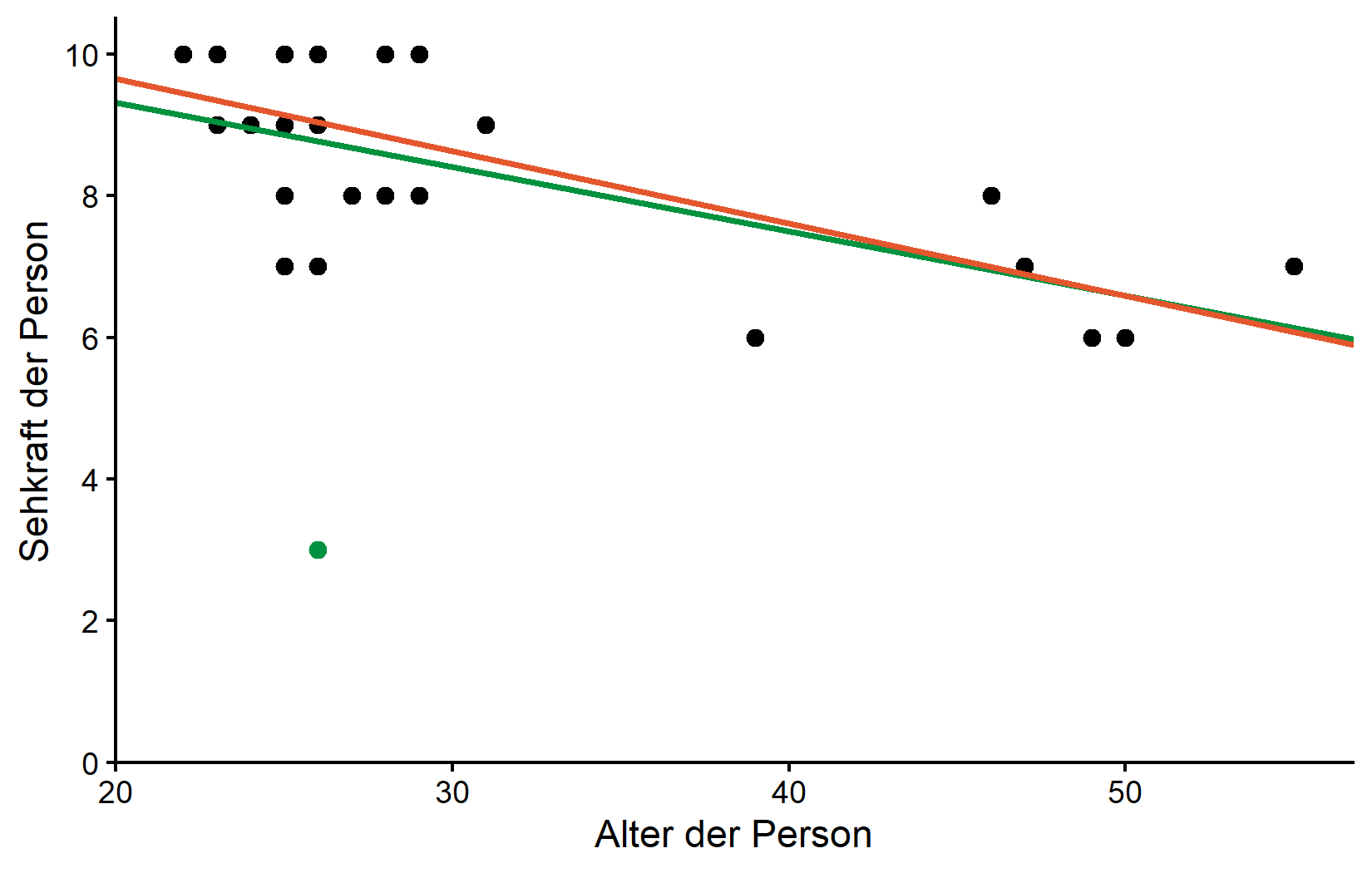 Diese Werte haben sich eigentlich nicht so stark verändert, wie es scheint. Vor der Entfernung von Rolando war das geschätzte Modell vision = 11,1 - 0,0910*ages und nach seiner Entfernung ist es vision = 11,7 - 0,102*ages. Wir können auch die Regressionslinie ohne den Ausreißer (orange) Seite an Seite mit der Regressionslinie einschließlich des Ausreißers (grün) von vorher visualisieren: